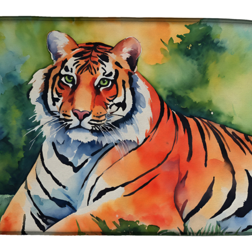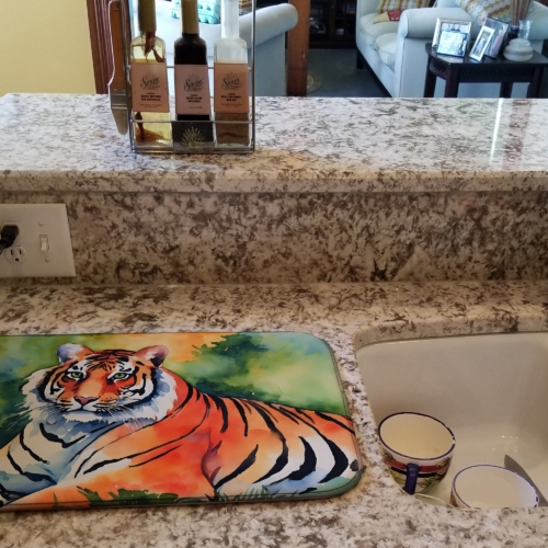 Dish Drying Mat featuring breed specific Bengal Tiger artwork. Say goodbye to messy countertops and soggy dish towels with our innovative dish drying mat. Our high-quality dish drying pad is designed to keep your countertops dry while offering a stylish and efficient solution. Whether you’re air drying dishes, glasses, stemware, silverware, pots, pans, bottles, or even fruits and vegetables, our dish mat is the perfect choice. The 14 inches x 22 inches size fits most counters and dish drying racks, and the non-slip design ensures stability. Made with water-absorbent polyester and a polyurethane foam insert, our dish drying mat is not only functional but also durable. It’s machine washable and printed in the USA for long-lasting use. The beautiful artwork adds flair to your kitchen decor, making it a perfect housewarming gift or present for any occasion. Upgrade your kitchen experience with our absorbent and versatile dish drying mat.