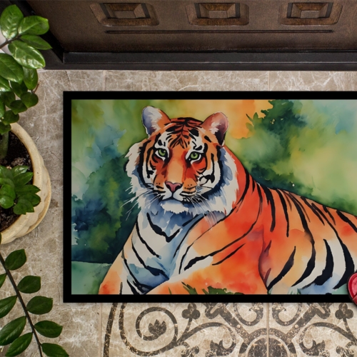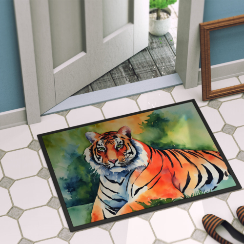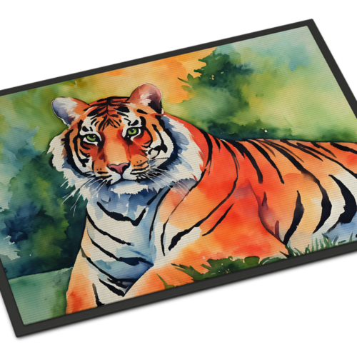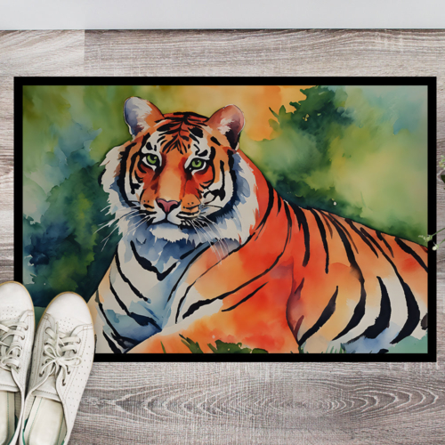 Doormat featuring breed specific Bengal Tiger artwork. Welcome your guests in style with our Artwork Door Mat, designed to withstand almost any weather condition. This mat, measuring approximately 18 by 27 inches, is held together by durable black binding tape. Its top layer, composed of polyester felt, is dyed with the eye-catching image you see on the mat. A few layers below provide the mat with stability, while its rubber bottom is stamped to help prevent slipping and ensures safety. Our mat works wonderfully as both an indoor or outdoor door mat. For cleaning, simply hose it off with water or use a power washer – no need for any cleaner that produces suds. Avoid scrubbing with a brush, instead, opt for the vacuum on floor setting. Designed manufactured and printed in the USA, this mat is a perfect addition to your porch, outdoor kitchen, entryway, or any indoor space. Its unique design makes it a charming decorative rug that greets your guests and adds a stylish touch to your home decor.
