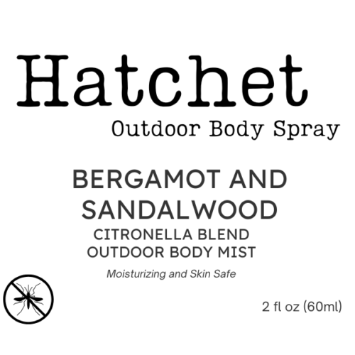 Hatchet – Bergamot and Sandalwood Bright. Woodsy. Balanced. Elevate your outdoor routine with this bold, aromatic blend of citrusy bergamot, delicate violet petals, smooth sandalwood, grounding patchouli, and a hint of fresh pine. Infused with citronella oil, this skin-safe body spray repels unwanted guests while wrapping you in an earthy, clean fragrance.Perfect for forest hikes, outdoor gatherings, or whenever you want to smell like nature—without attracting nature. Primary/Active Ingredients: RO/DI Water, Butoxydiglycol, Ethylhexylglycerin, Glycerin, Ethylhexyl Salicylate, Phenoxyethanol, Hydroxylacetophenone, Fragrance Oils