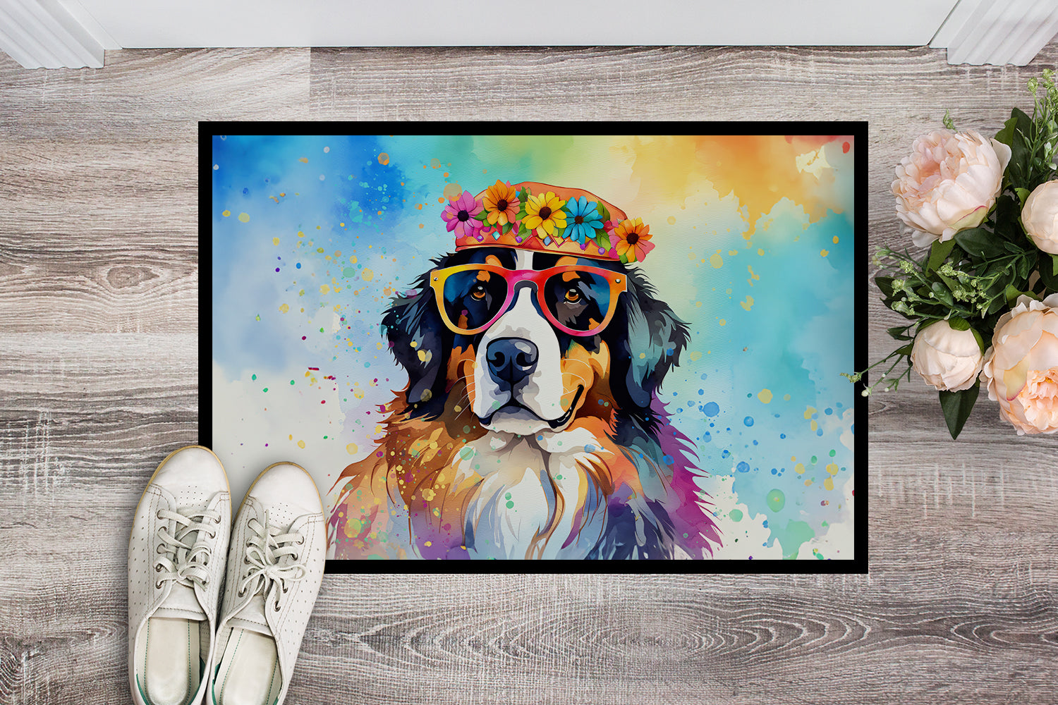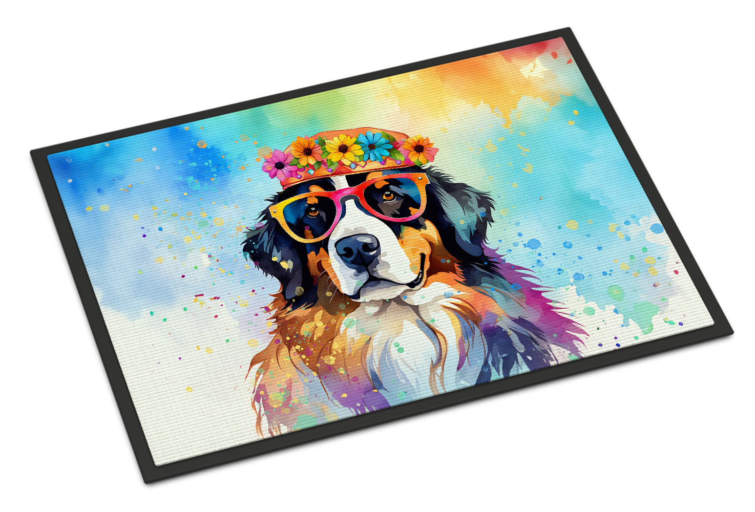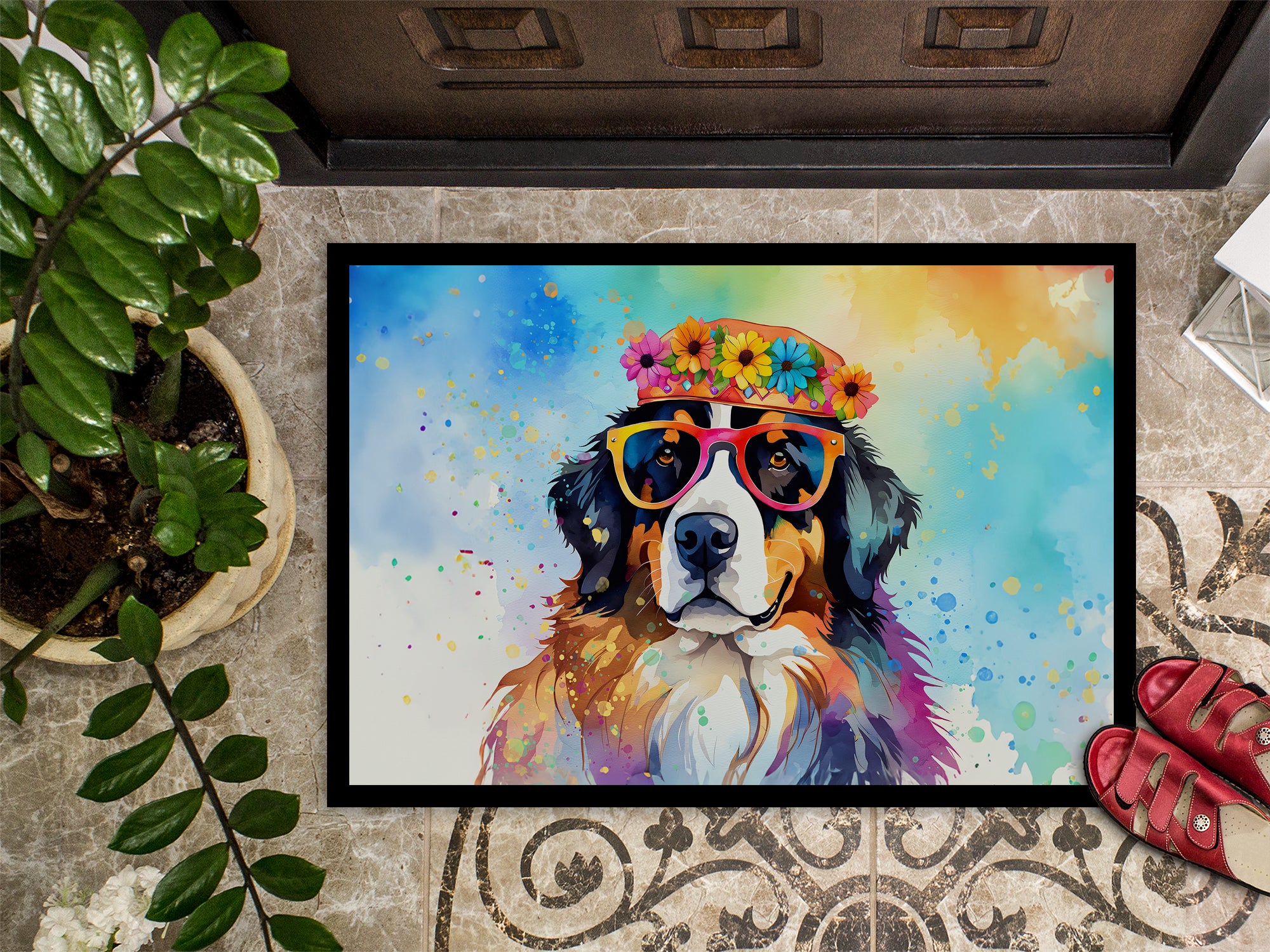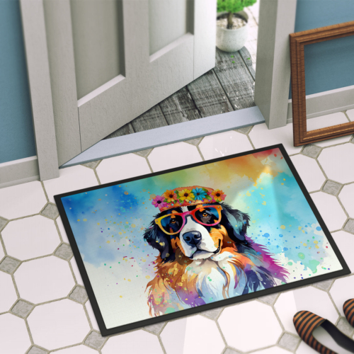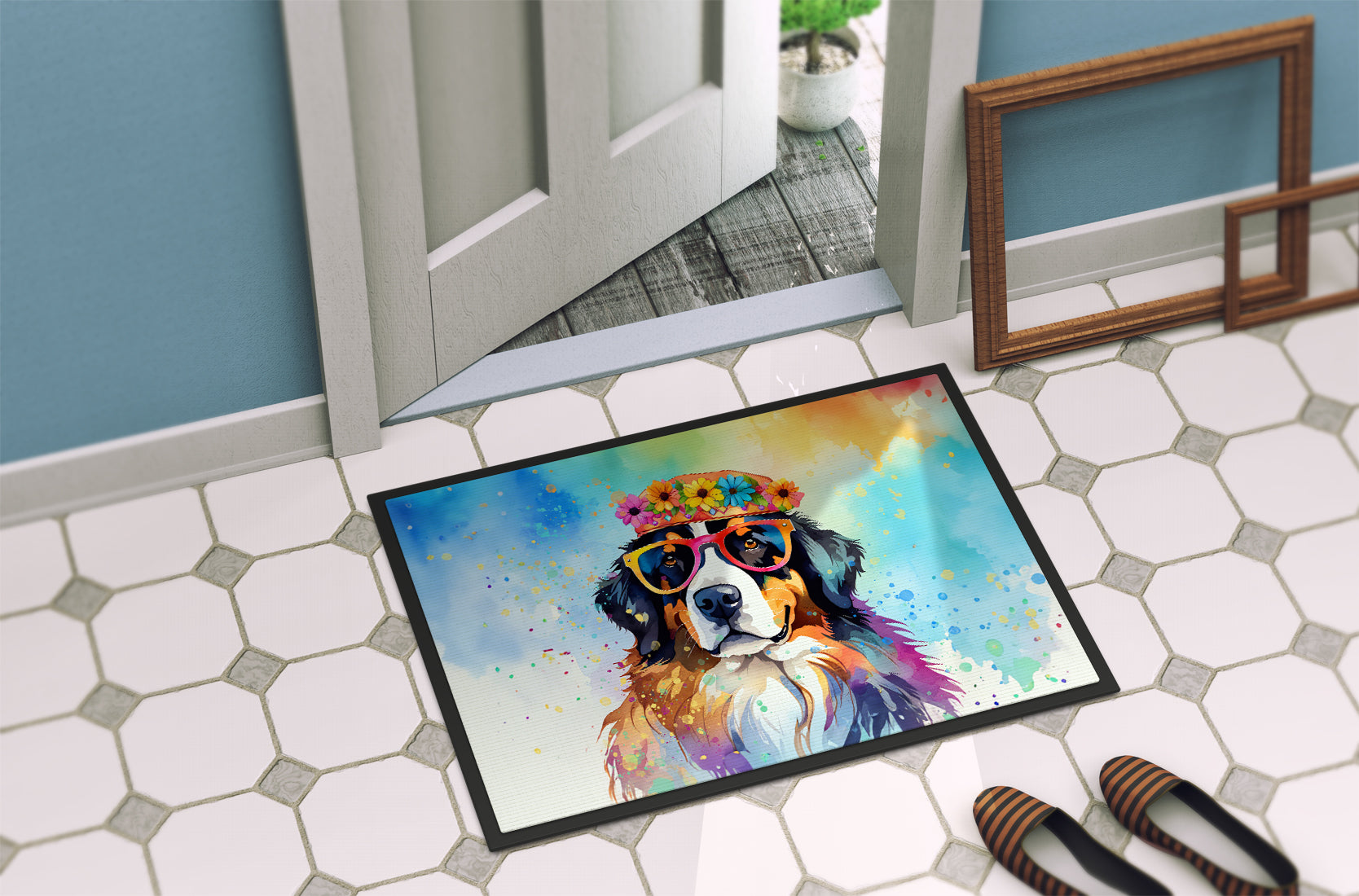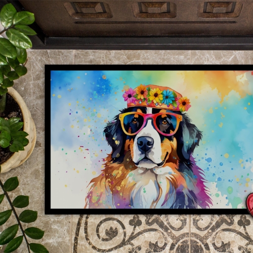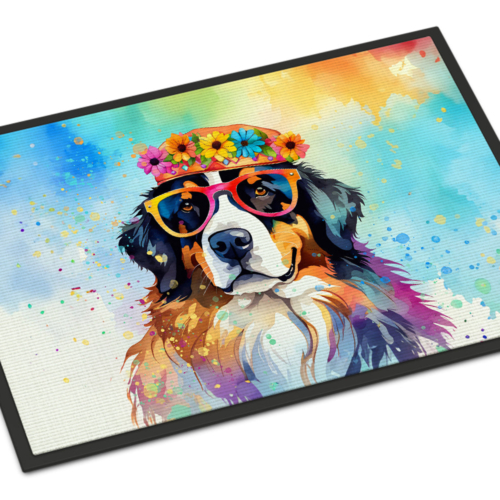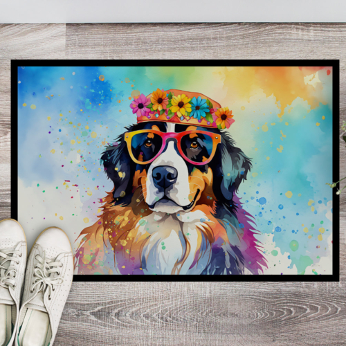Doormat featuring breed specific Bernese Mountain Dog artwork. Welcome your guests in style with our Artwork Door Mat, designed to withstand almost any weather condition. This mat, measuring approximately 24 by 36 inches, is held together by durable black binding tape. Its top layer, composed of polyester felt, is dyed with the eye-catching image you see on the mat. A few layers below provide the mat with stability, while its rubber bottom is stamped to help prevent slipping and ensures safety. Our mat works wonderfully as both an indoor or outdoor door mat. For cleaning, simply hose it off with water or use a power washer – no need for any cleaner that produces suds. Avoid scrubbing with a brush, instead, opt for the vacuum on floor setting. Designed manufactured and printed in the USA, this mat is a perfect addition to your porch, outdoor kitchen, entryway, or any indoor space. Its unique design makes it a charming decorative rug that greets your guests and adds a stylish touch to your home decor.