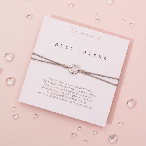 Best Friend Wish Bracelet String bracelet comes with an ivory paper envelope. Material – Polyester thread and cubic zirconias Length – Adjustable with slider tie Makes a GREAT Gift! Card says; “This isn’t one of those soppy rhymes, but a simple reminder to my partner in crime. I’ll have your back through thick and thin, because you’re my girl, my bestie, my twin. A sparkly treat for all that you do, you’re an absolute Queen and I appreciate you.” Made in United Kingdom