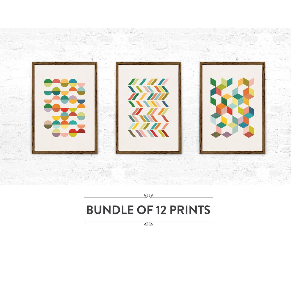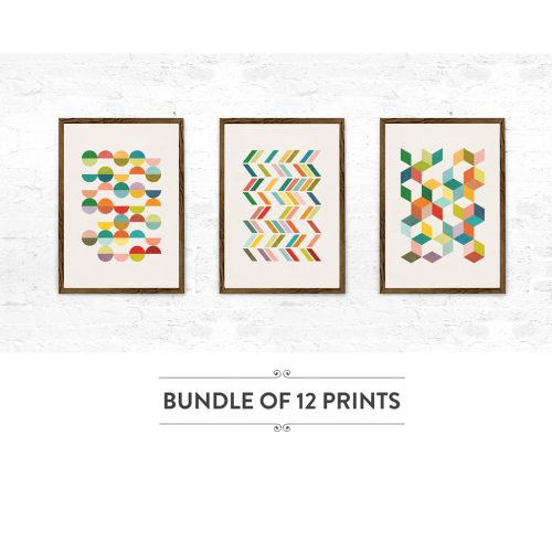 This bundle contains 12 geometric giclée prints. High quality prints rich and vibrant in colour with a light vintage texture, and printed on heavyweight matte art paper. All prints are supplied individually packed inside a cello bag with backging board (frame not included)