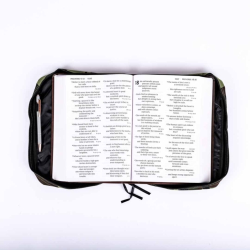 Stylish, functional, and built for durability, this Canvas Bible Cover is the ideal way to protect and carry your Bible with ease and purpose. Featuring a bold camo pattern in shades of green and brown, it is beautifully accented with a God’s Army PVC patch, making it a meaningful statement of faith for any believer. This cover is thoughtfully designed to combine practicality and style, ensuring your Bible stays protected while reflecting your commitment to faith.
