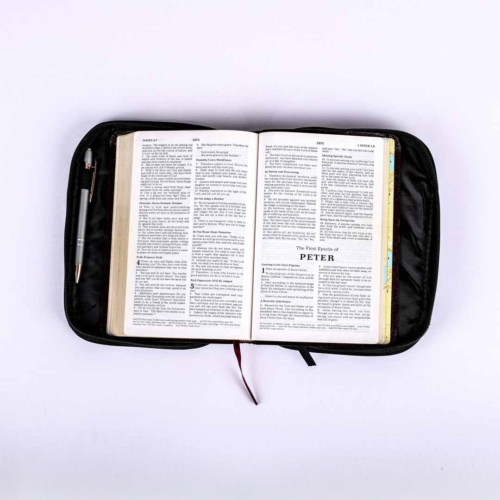 This bible cover is the perfect way to protect your bible while on the go. The durable canvas material will keep your bible safe from scratches, spills, and wear and tear. Features a convenient carry handle, making it easy to take with you wherever you go. The pen loop on the inside allows you to keep a pen or pencil close at hand, so you can take notes or mark passages as you read. The ribbon bookmark ensures that you can easily pick up where you left off, and the sturdy zipper keeps the cover securely closed when not in use.