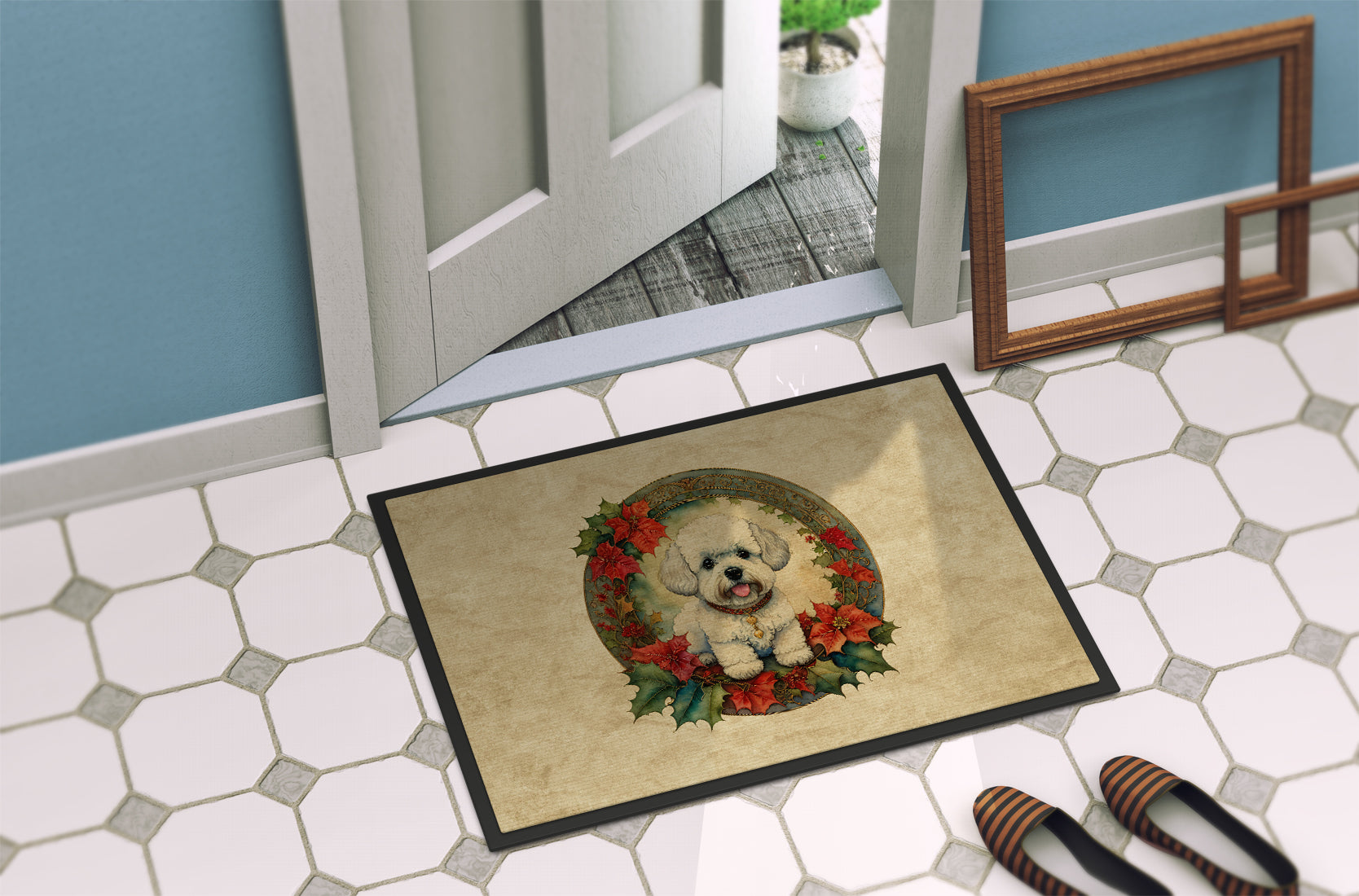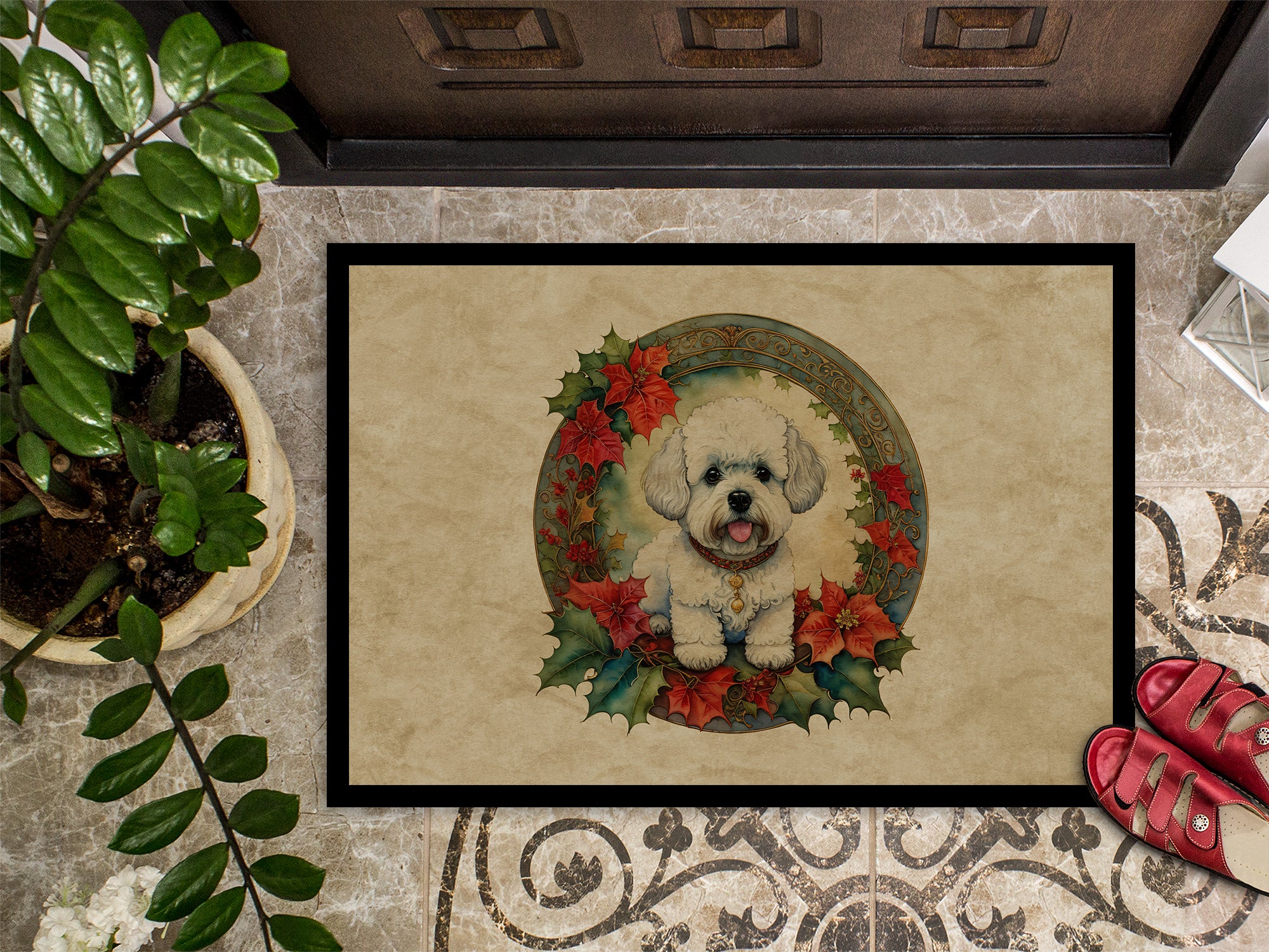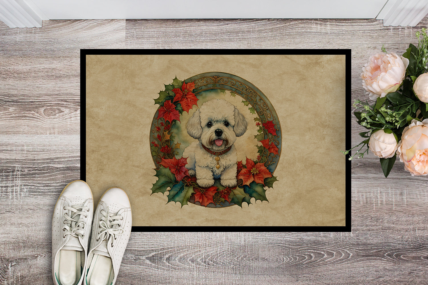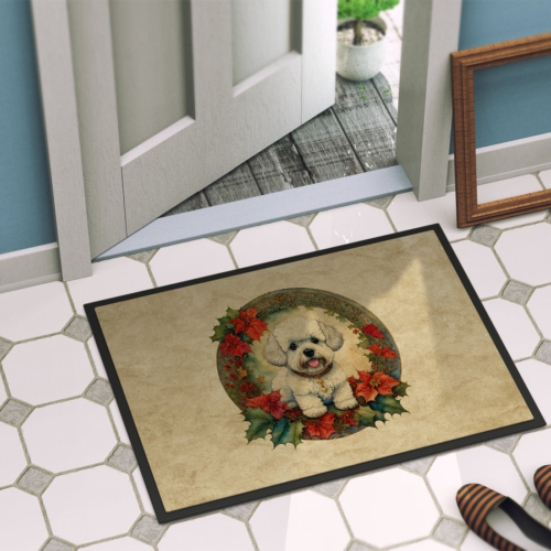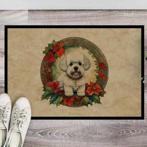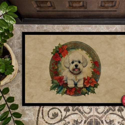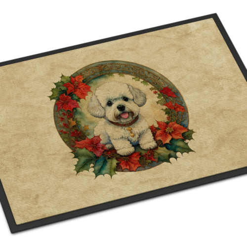 Doormat featuring breed specific Bichon Frise artwork. Celebrate Christmas with this Christmas Doormat. Welcome your guests in style with our Artwork Door Mat, designed to withstand almost any weather condition. This mat, measuring approximately 24 by 36 inches, is held together by durable black binding tape. Its top layer, composed of polyester felt, is dyed with the eye-catching image you see on the mat. A few layers below provide the mat with stability, while its rubber bottom is stamped to help prevent slipping and ensures safety. Our mat works wonderfully as both an indoor or outdoor door mat. For cleaning, simply hose it off with water or use a power washer – no need for any cleaner that produces suds. Avoid scrubbing with a brush, instead, opt for the vacuum on floor setting. Designed manufactured and printed in the USA, this mat is a perfect addition to your porch, outdoor kitchen, entryway, or any indoor space. Its unique design makes it a charming decorative rug that greets your guests and adds a stylish touch to your home decor.