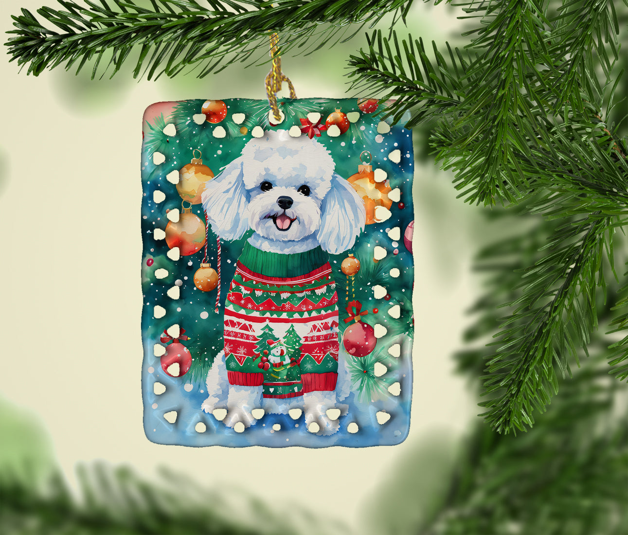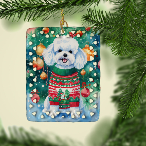 Porcelain Ornament featuring breed specific Bichon Frise artwork. Celebrate Christmas with this Christmas Ornament. Add a unique, personal touch to your holiday decor with our Rectangular Lattice Porcelain Ornament. Perfect for creating cherished memories, this high-quality ornament shines under festive lights, reflecting warmth and joy throughout your Christmas tree. Crafted with a glossy finish, it showcases vibrant, full-color artwork contributed by our talented artists, ensuring your tree is adorned with a burst of color and holiday spirit. What sets this Porcelain Ornament apart is its customizable white back. Use a paint pen or permanent marker to write a heartfelt message, commemorate a special year, or mark an unforgettable date, turning this ornament into a keepsake that will be treasured for years to come. For best results, allow any personalization to dry thoroughly before handling. Each ornament comes complete with a delicate gold cord, making it easy to hang and display. Proudly made in the USA, this ornament measures 3.375 x 2.625 inches and is a thoughtful gift for pet sitters, teachers, family members, or anyone who would appreciate a little extra holiday magic. Bring style, charm, and a touch of personal meaning to your Christmas tree with this beautifully designed ornament..