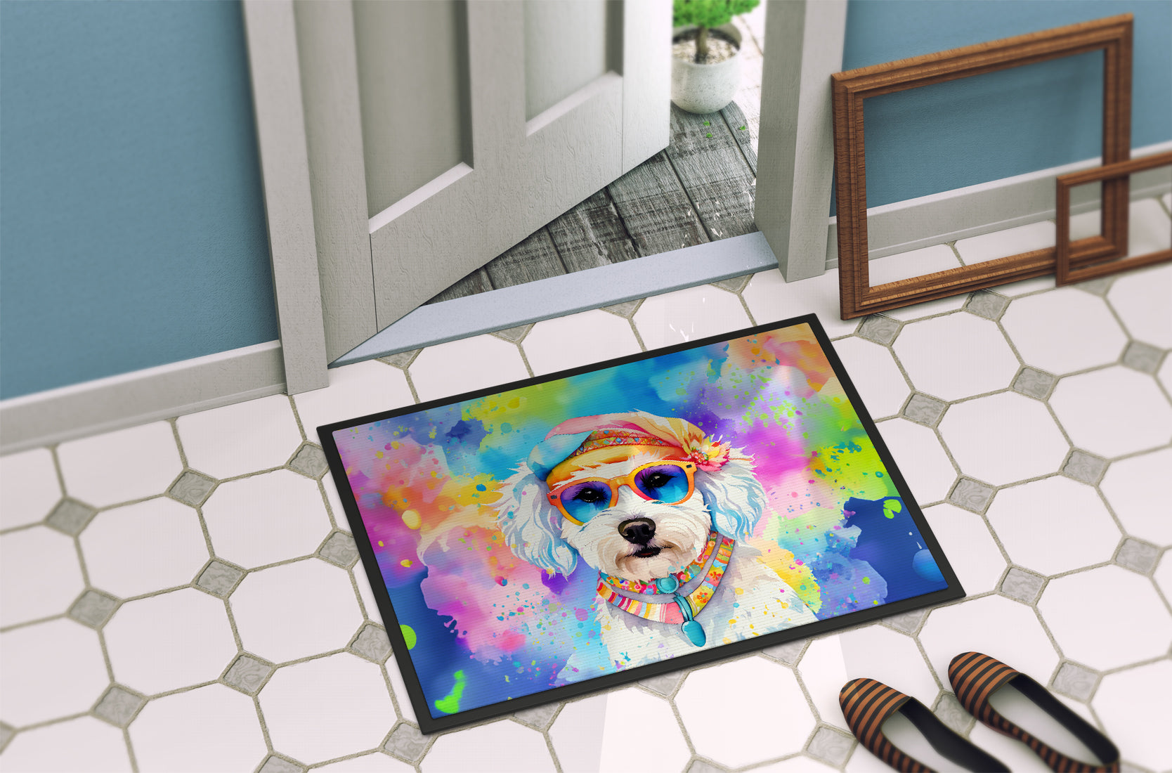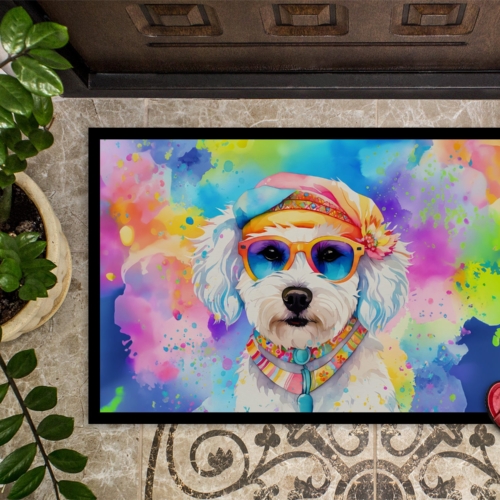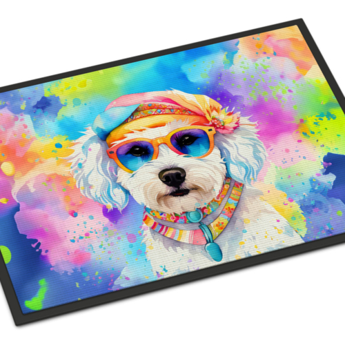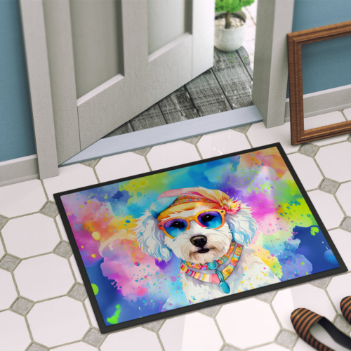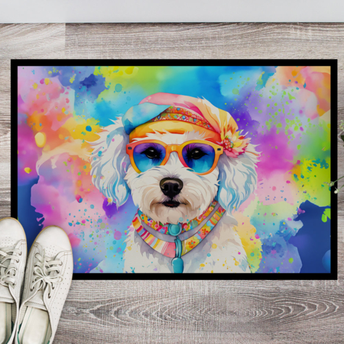 Doormat featuring breed specific Bichon Frise artwork. Welcome your guests in style with our Artwork Door Mat, designed to withstand almost any weather condition. This mat, measuring approximately 18 by 27 inches, is held together by durable black binding tape. Its top layer, composed of polyester felt, is dyed with the eye-catching image you see on the mat. A few layers below provide the mat with stability, while its rubber bottom is stamped to help prevent slipping and ensures safety. Our mat works wonderfully as both an indoor or outdoor door mat. For cleaning, simply hose it off with water or use a power washer – no need for any cleaner that produces suds. Avoid scrubbing with a brush, instead, opt for the vacuum on floor setting. Designed manufactured and printed in the USA, this mat is a perfect addition to your porch, outdoor kitchen, entryway, or any indoor space. Its unique design makes it a charming decorative rug that greets your guests and adds a stylish touch to your home decor.