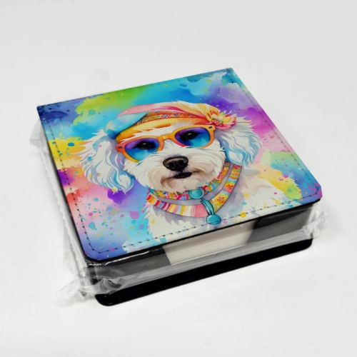 PU Leather Note Paper Holder featuring breed specific Bichon Frise artwork. Elevate your workspace with this PU Leather Note Paper Holder, crafted to resemble luxurious leather without the use of animal products. Made from durable synthetic PU leather, it offers both a premium look and eco-friendly appeal. This note holder, compactly sized at 4.25 x 4.25 x 1.25 inches, includes about 160 sheets of 3.75 x 3.75-inch note paper—ideal for quick notes and reminders. An exclusive artist-designed cover makes each holder uniquely vibrant, adding a splash of color and personality to any desk or office. The discrete design keeps note paper hidden, maintaining a neat and organized workspace. Perfect as a gift or for personal use, this stylish holder is refillable with standard paper, ensuring long-lasting utility. A must-have for anyone seeking a sophisticated, artful touch to their workspace while supporting animal-friendly products. Add style, organization, and creativity to your everyday routine with this elegant note paper holder.