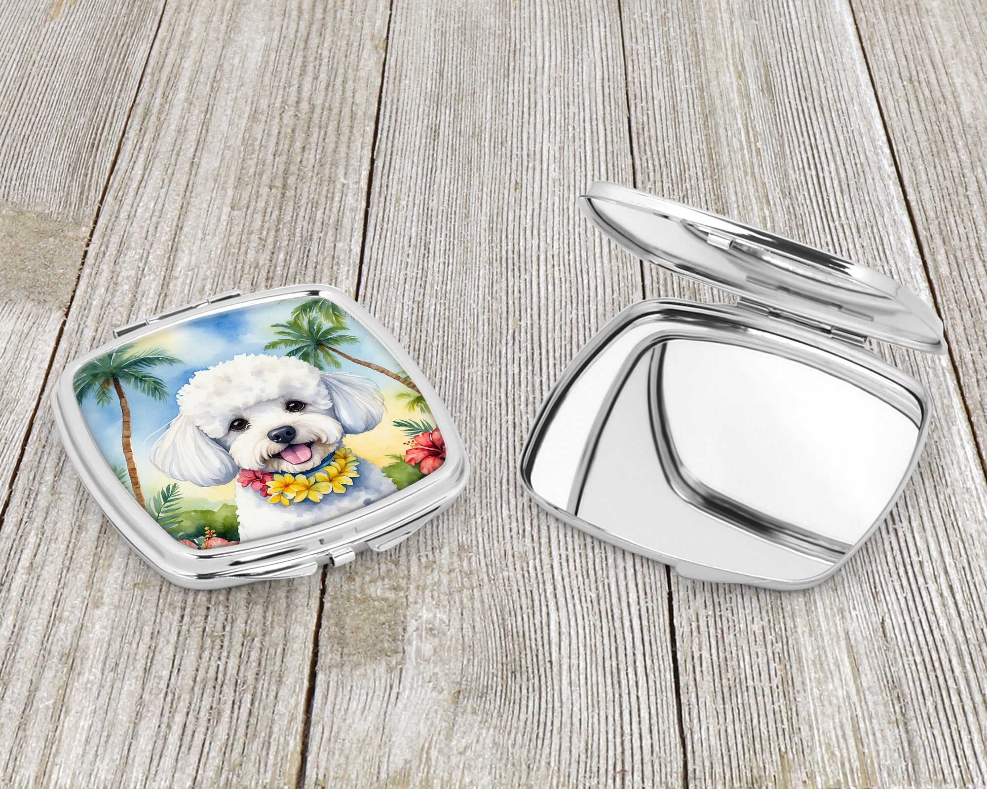Compact Mirror featuring breed specific Bichon Frise artwork. Introducing our Square Compact Mirror, a blend of elegance, functionality, and compactness, perfect for on-the-go touch-ups. This Silvertone metal mirror, with dimensions of 2.75 inches x 3 inches x .3 inches, fits effortlessly into your purse, handbag, or pocket, ensuring that you can check your appearance anytime, anywhere. Our compact mirror stands out with its eye-catching artwork on the front, adding a dash of style to this practical accessory. It is more than just a mirror; it’s a statement piece that reflects your personality and aesthetic. When opened, this compact reveals two mirrors inside, doubling your perspective for precise touch-ups. The Silvertone metal construction ensures durability while maintaining a lightweight feel, making it an ideal everyday carry item. Whether you’re rushing to a meeting, prepping for a dinner date, or just need a quick check on your look, our Square Compact Mirror is your reliable companion. Experience the perfect blend of style and practicality with this must-have accessory.