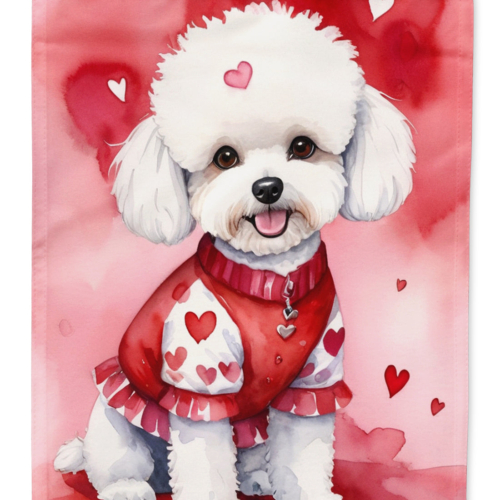 House Flag featuring breed specific Bichon Frise artwork. Celebrate Valentine’s Day with this Valentine’s Day Large Flag. Presenting our Heavy Duty Polyester House Size Decorative Sleeve Pole Flag, a vibrant addition to enhance the aesthetic appeal of your home. This large decorative flag, measuring approximately 28 x 40 inches, offers ample coverage and visibility. Each flag is meticulously sewn and made individually, ensuring a unique piece that may slightly vary in size. It’s a sleeve pole flag, designed to fit a standard decorative flag pole effortlessly. Please note that the flag pole and bracket are not included and should be purchased separately. What sets our flag apart is its dual-sided print. The design is mirrored on both sides of the fabric, allowing for uniform visibility regardless of the angle. Printed in full color, our flag showcases vibrant hues that truly stand out. To ensure lasting vibrancy and durability, the dyes are heat-set into the fabric. This ensures your flag remains bright and captivating through various weather conditions. Elevate the look of your home with our Heavy Duty Polyester House Size Decorative Sleeve Pole Flag!