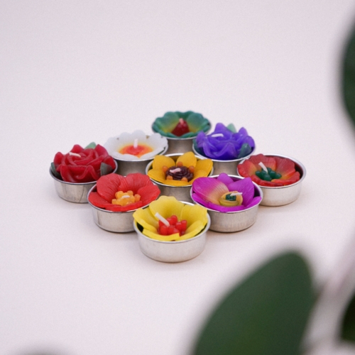 Adding tropical vibes with these blossom and bloom scented tealights in assorted tropical flower design. Each flower candle pops up high from a tin cup showing off its beauty. Scented with Neroli essential oil a sweet, honeyed and relaxing. They can be used with any standard tealight holders. An impressive gift for any special occasions. 100% Handmade, vegan, cruelty free and fairly trade