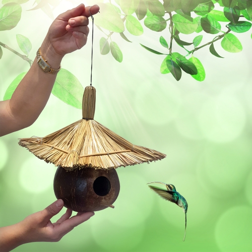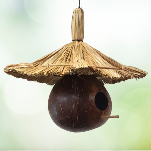 Bring a touch of nature to your outdoor space with this Coconut & Straw Bird Feeder/House, designed to provide a cosy home for birds while adding a rustic aesthetic to your garden. Crafted from natural coconut shells and straw, this charming bird house offers a durable and sustainable option for feeding or sheltering small birds. With an approximate hanging height of 35cm, it�s perfect for hanging on trees, fences, or porches to create an inviting bird sanctuary. The blend of coconut and straw ensures a natural, eco-friendly construction, offering both comfort and protection for your feathered friends. Each piece is uniquely made, giving you a one-of-a-kind addition to your outdoor decor.