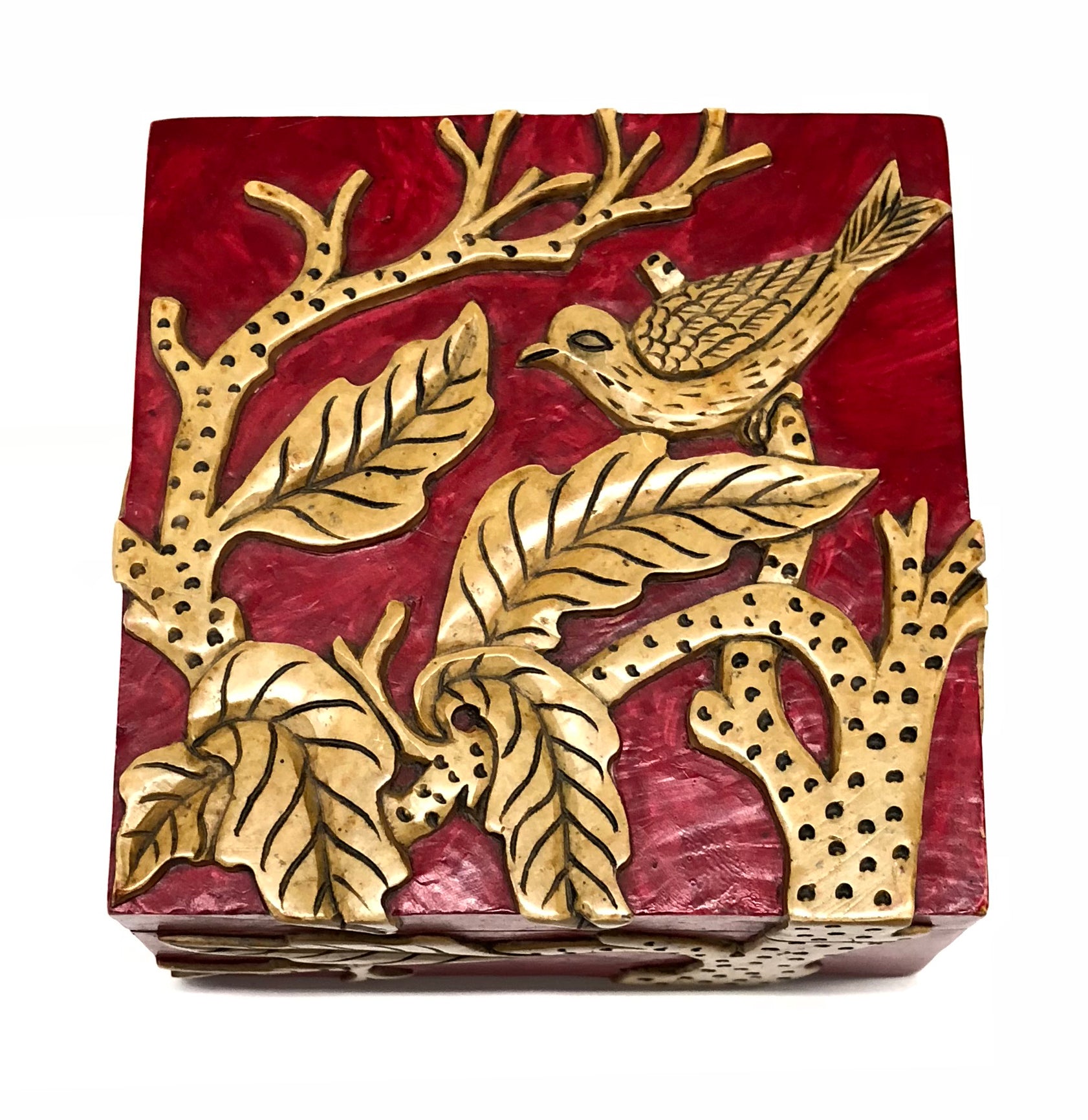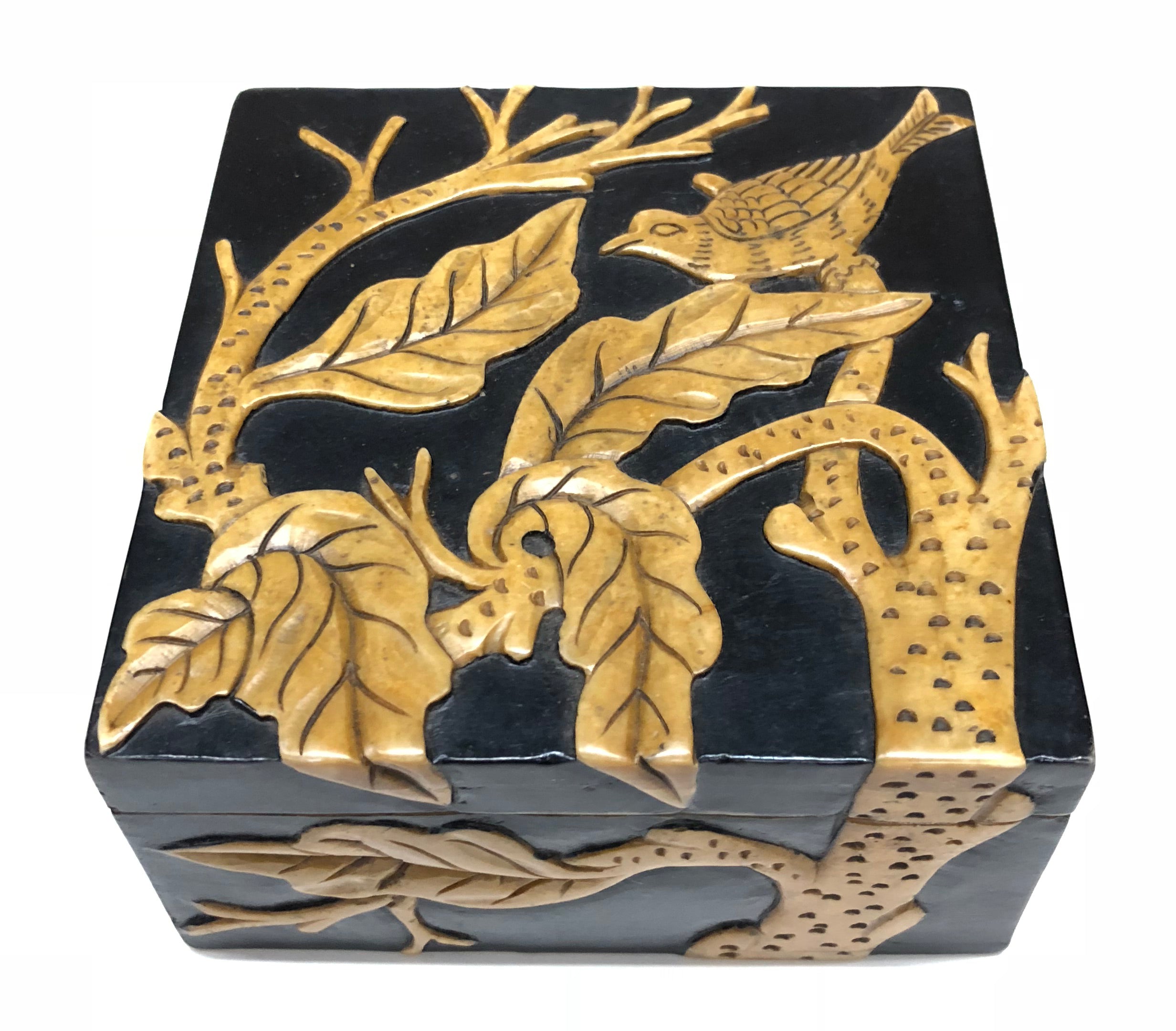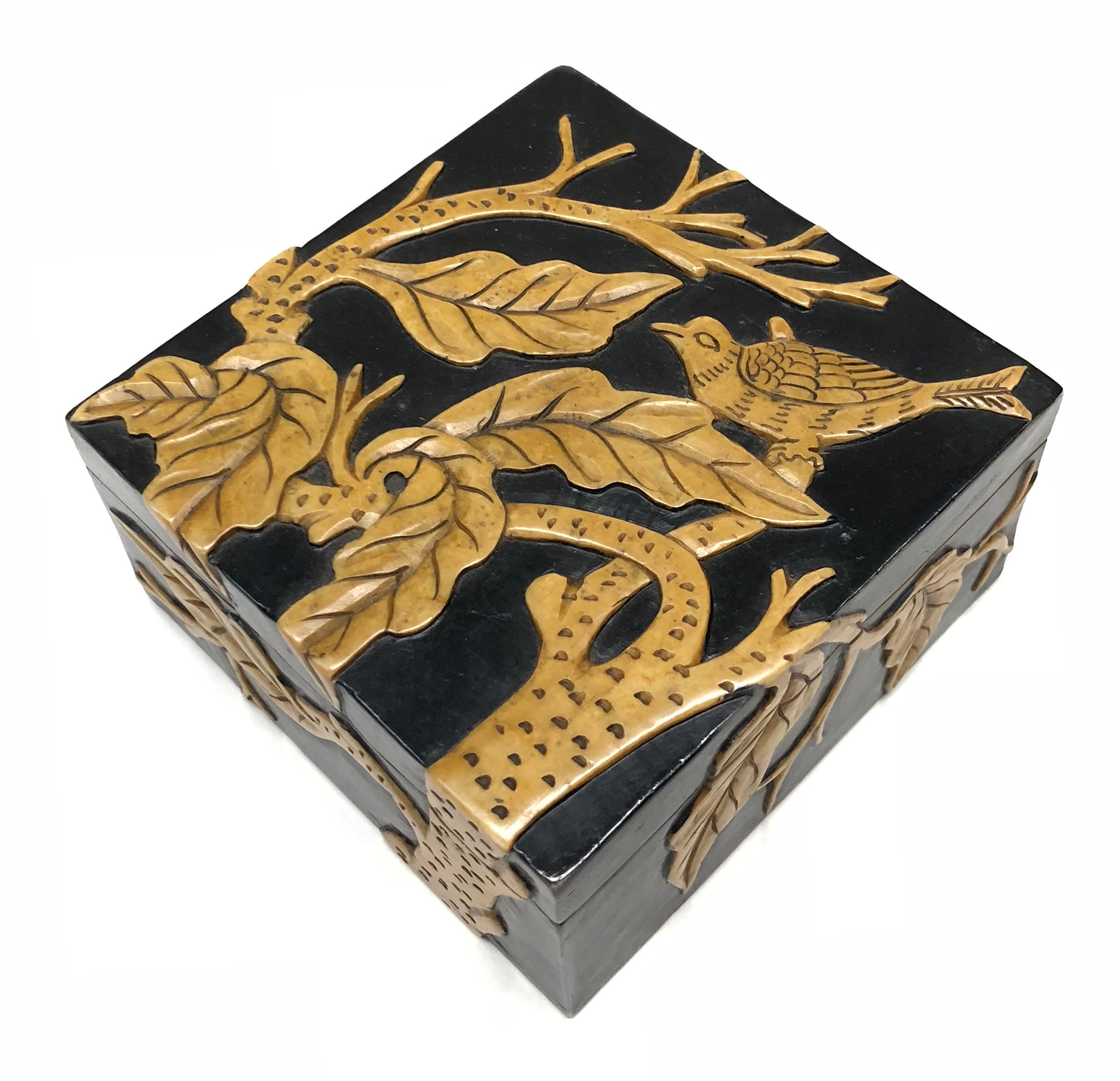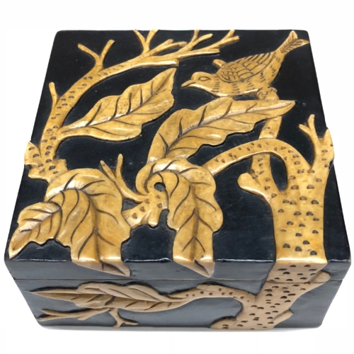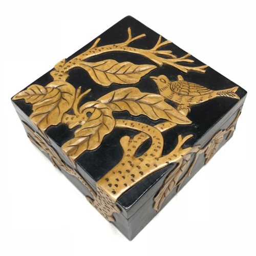Soapstone is a soft rock that is capable of being carved and etched to great deal without fracturing. It is mined in the mountains of Quang Ninh in northern Viet Nam. Each box is a symbol of both the aesthetics and talent of the Vietnamese artisans. The soapstone is designed, carved and painted to produce a complete masterpiece. Each box consists of a variety of colors and shades, lines and curves, shapes and sizes which are handled with care by many different artisans. Every box takes hours to finish ultimately to become a one of a kind piece, truly a reflexion of the character of Vietnam you cannot find anywhere else. Though it is rock, the soapstone is fragile and will break if it is dropped. It will be shipped to you in a box surrounded by bubble-wrap to ensure its safety. This box measures 10 x 10 x 5 cm (4 x 4 x 2″). Available in black or red background. Enjoy.