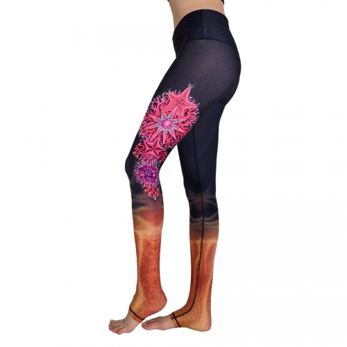 Fire Coral leggings will be the perfect pair for a night out paired with chunky boots and a sweater as well as for a sweaty gym session. Black color paired with golden hues combined with coral and starfish image on the left leg.