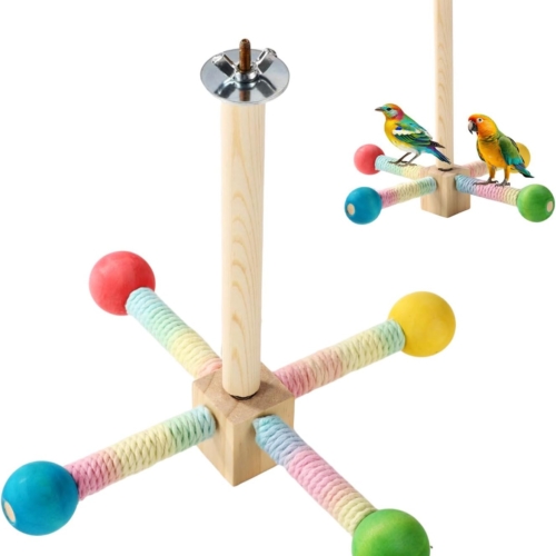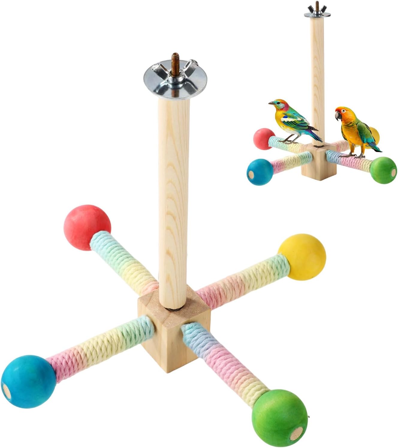 Product Included: You will receive 1 piece of bird stand perch, which consists of 1 piece of vertical rod, 4 pieces of horizontal rod, 1 piece of long screw, 1 piece of hexagonal nut, 2 pieces of gaskets, 1 piece of wingnut, and 1 piece of block.Reliable Material: Made of prime quality wood and stainless steel, the bird stand perch toy is solid and sturdy, not easy to break or deform, which can serve your bird for a long time. You can use it with confidence.Size Information: The interactive parrot toy measures about 8.27×8.27×7.48in/21x21x19cm after assembled, suitable for small to medium-sized parrots and similar-sized birds. Please confirm the size of the cage before purchase.Easy to Use: First, put the long screw into the hole that with bearing in the block then screw on the the vertical rod. Second, screw on 4 horizontal rods with colored cotton threads. Third, use gaskets and wingnut to fix the parrot standing perch into the cage.Good Bird Toy: The bird stand perch not only can offer a place for your birds to rest, but also can helps birds exercise and improve their balance skills. You can manually rotate the perch to interact with your beloved bird.