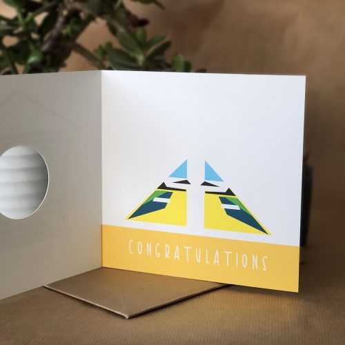 Introducing our delightful Square 15 x 15 cm “New Home” card, thoughtfully designed to celebrate the excitement of a fresh start. Featuring a charming aperture cutout that offers a peek at our enchanting geometric bird design, this card captures the essence of new beginnings. At the forefront, two blue tits are depicted, their gaze locked in an affectionate exchange symbolizing companionship and unity as they embark on this journey together. Inside, you’ll find the heartfelt message “Congratulations,” expressing joy and best wishes for the recipient’s new home. Crafted from high-quality 300gsm recycled card stock, our “New Home” card embodies both durability and sustainability. Each card is paired with a Kraft envelope, adding a rustic touch to your greetings. For added protection, our cards are enclosed in a cellophane pocket, ensuring they arrive in pristine condition. However, should you prefer to minimize plastic usage, we offer the option to send the card without the cello pocket upon request. Celebrate the joy of a new home with our charming “New Home” card, where creativity and heartfelt sentiments come together to create a truly memorable experience.