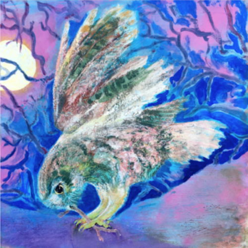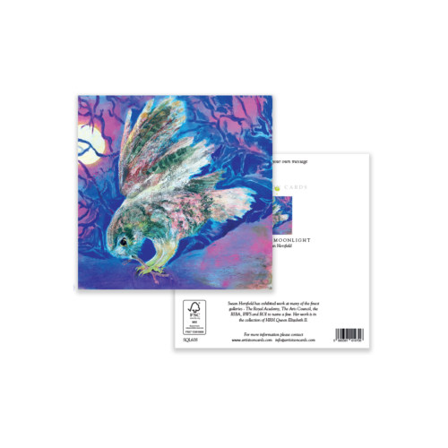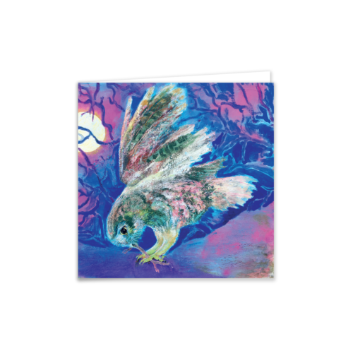A magical owl greeting card featuring a young owlett illuminated by the moonlight. With vibrant shades of blue, pink, and silver, this artwork captures the mystery of the night sky and the quiet beauty of nocturnal wildlife.