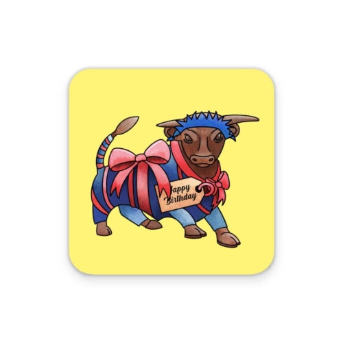 These fun hardboard coasters feature the infamous bullring bull in 4 different birthday themed outfits: