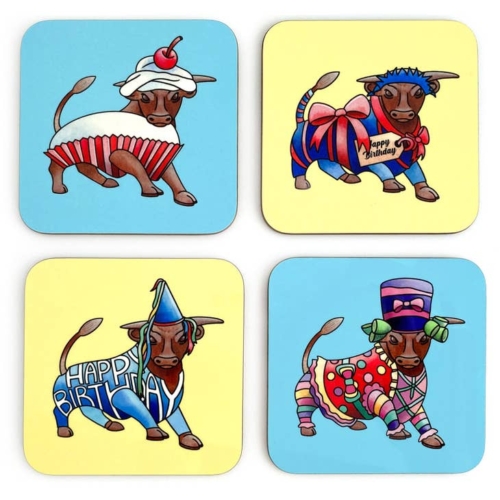 These fun hardboard coasters feature the infamous bullring bull in 4 different birthday themed outfits: