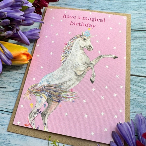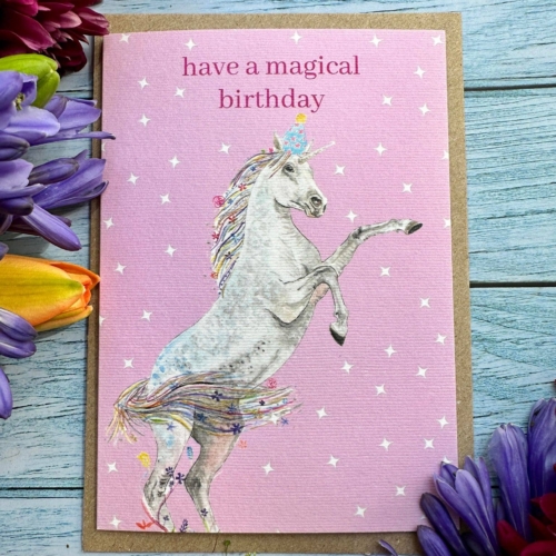 Birthday Unicorn – Have a magical birthday | Pink | Childrens | Eco Friendly Card | Colourful | Birthday Blank | Friend | Blank | Occasion | Greetings | Farm | Jen Winnett Art Eco Artist