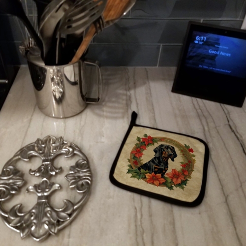 Pair of Pot Holders featuring breed specific Black and Tan Coonhound artwork. Celebrate Christmas with this Christmas Pair of Pot Holders. A Pair of Pot Holders to match your kitchen decor. Made in the USA these are thick and functional. Full color artwork decorates the front polyester fabric of the hot pad and accented by a black trim. Use these at as a trivet for your Thanksgiving or Christmas tablescape. Filled with insulated fabric and quilted for durability. These colorful pot holders will make a great gift for your favorite home cook or executive chef. Each pot holder measures approximately 7 1/2 inches by 7 1/2 inches. A hanging tab is included.