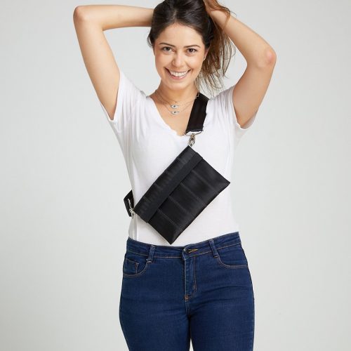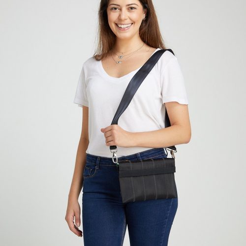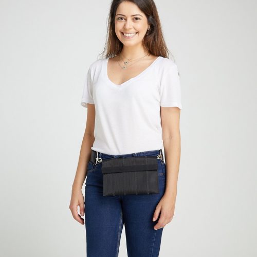 An undeniably versatile black sustainable clutch bag created by From Belo, from decommissioned seatbelts destined for landfill. Supporting our objectives to deliver eco and sustainable products by repurposing unused materials, to create beautiful fashion accessories.