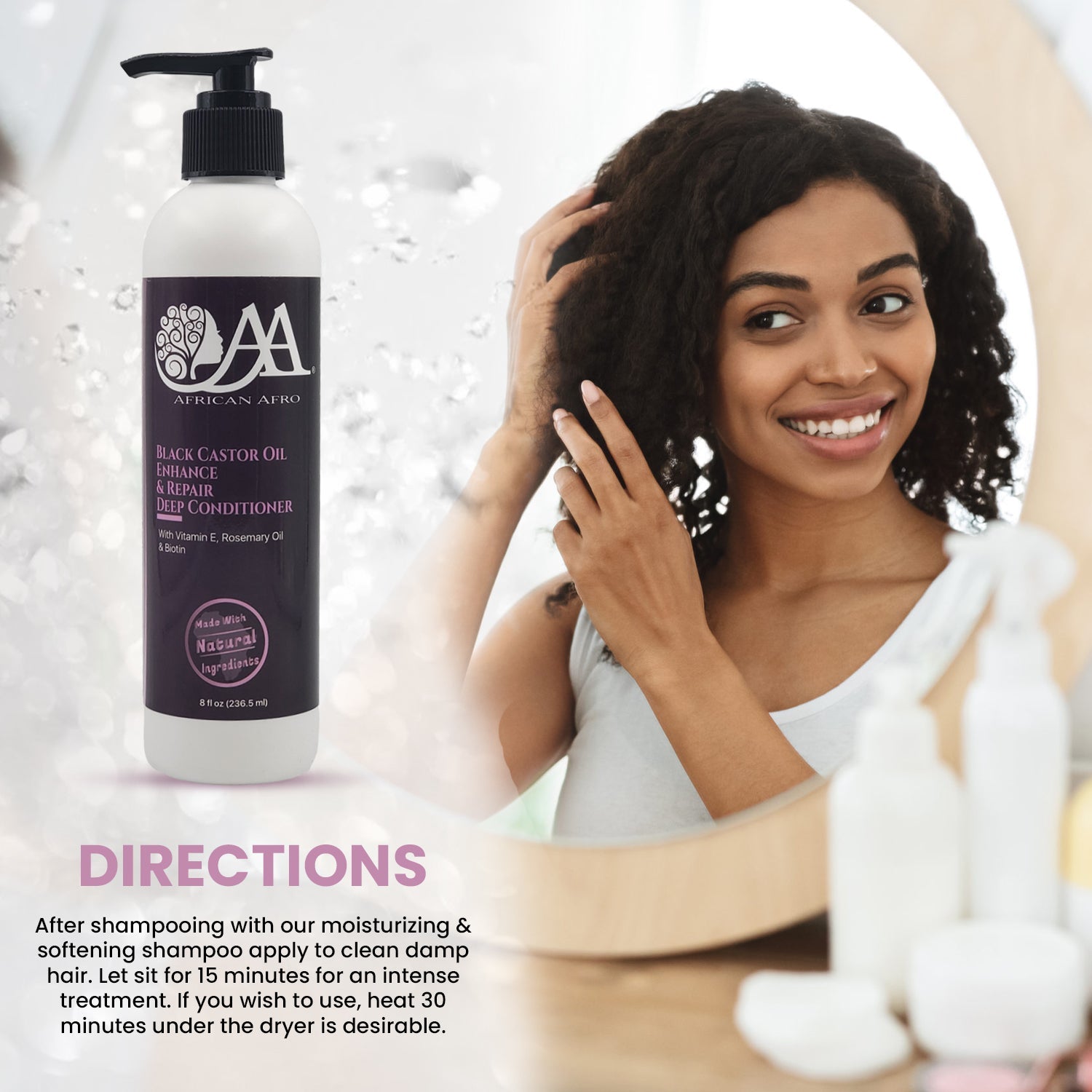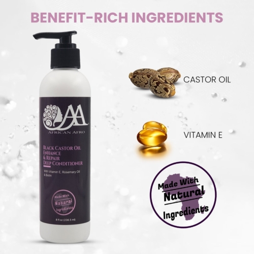 At African Afro, we’ve created an enhancing hair conditioning formula that detangles and rehydrates hair without weighing it down. The natural Jamaican Black Castor Oil and Rosemary Oil nourish and repair damaged, brittle hair while decreasing the appearance of breaking and shedding. Our Jamaican black castor oil conditioner is formulated to be able to be used for any type of hair. Features:- Natural Enhance and Repair Deep Conditioner- For Use with All Hair Types- Cruelty-Free Manufacturing- Helps Reduce Split Ends The natural Jamaican Black Castor Oil and Rosemary Oil nourish and repair damaged, brittle hair while decreasing the appearance of breaking and shedding. Whether you have curly hair, frizzy hair, straight hair, thick or thin hair, artificially dyed or natural, our cruelty-free, natural conditioner is sure to provide results. Turn to this natural conditioner for immediate care that leaves hair lustrous and revitalized, while helping to protect it from future damage. Our deep castor conditioner is the ideal moisturizing and growth-stimulating mixture for all hair types and textures.