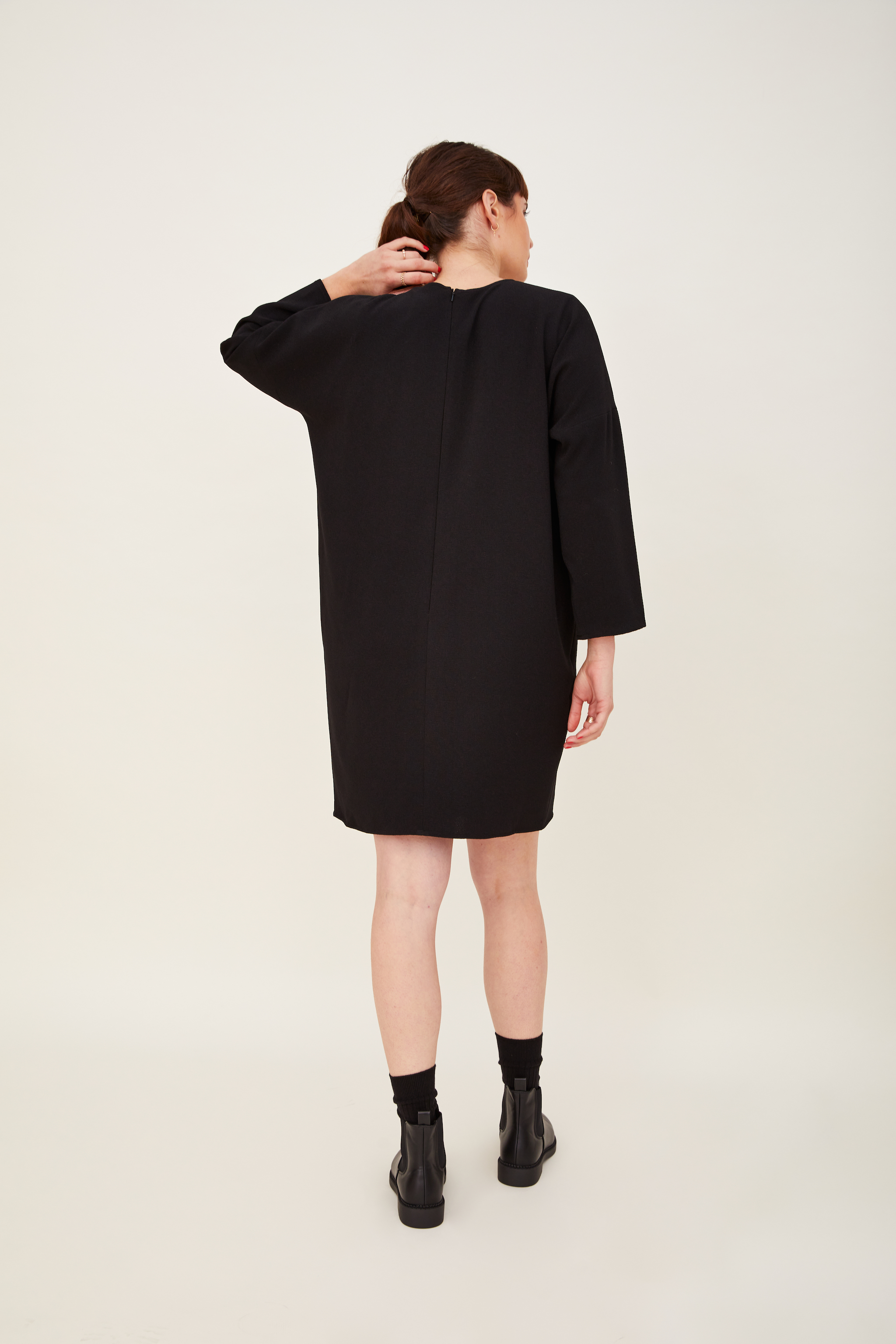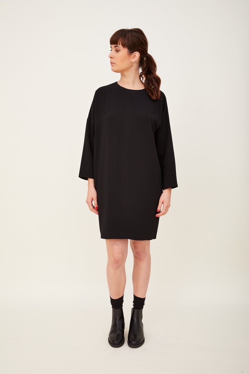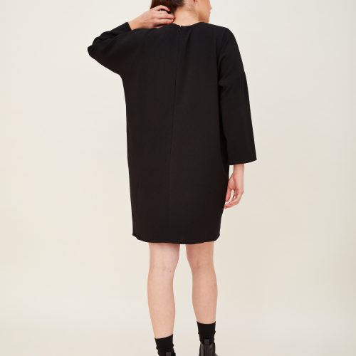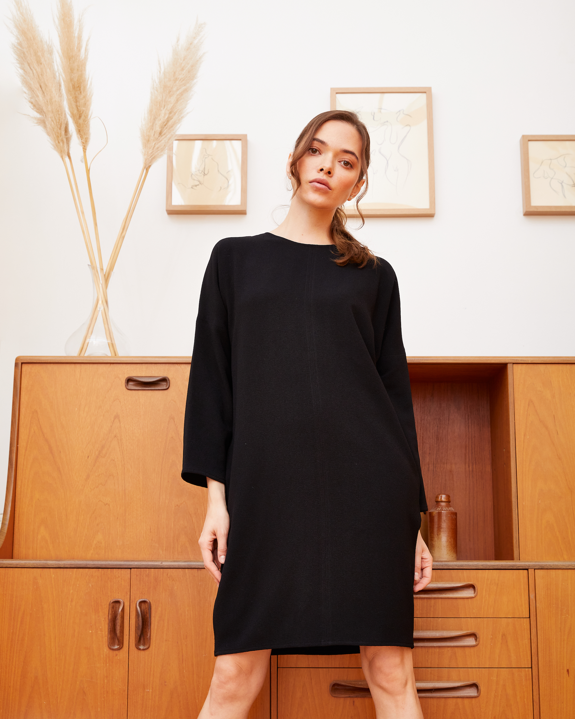 Designed with an everyday essence in mind, this loose silhouette with exaggerated dropped sleeves and boat finish neckline to flash the collar bone, creates a beautiful eternal dress. Inspired by the Little Black Dress deemed a necessity I wanted this style to be a piece we could style across several outfit creations, to be worn again and again with easy yet flattering layer-ability. Created from a deadstock line of gorgeously textured polyester crepe with a light lining, light enough for those balmy evenings yet loose enough for wrapping up on your crisp morning commutes identifies this as your forever piece.