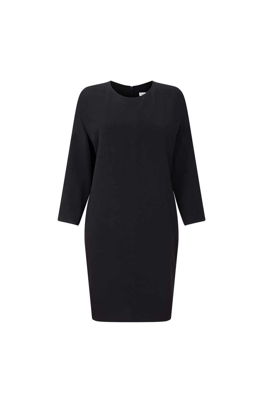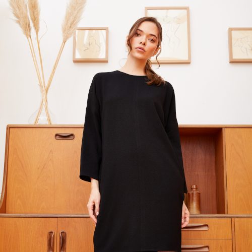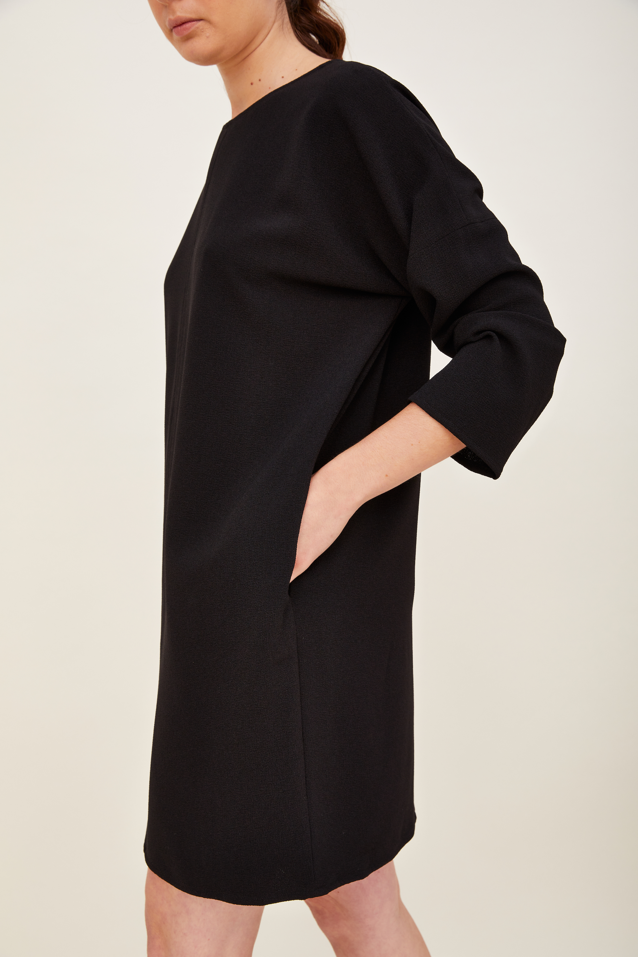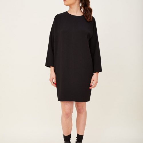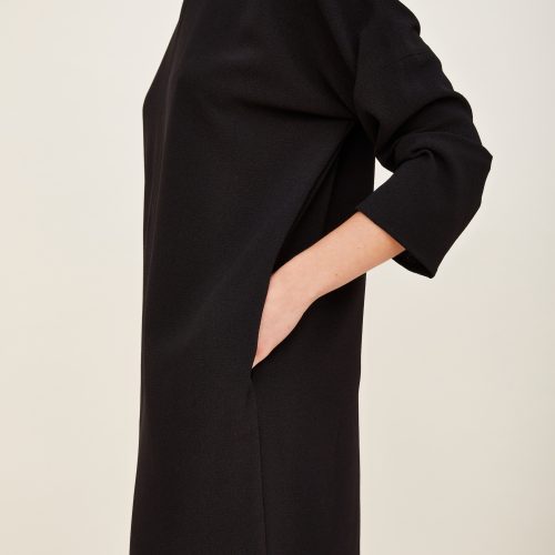 Designed with an everyday essence in mind, this loose silhouette with exaggerated dropped sleeves and boat finish neckline to flash the collar bone, creates a beautiful eternal dress. Inspired by the Little Black Dress deemed a necessity I wanted this style to be a piece we could style across several outfit creations, to be worn again and again with easy yet flattering layer-ability. Created from a deadstock line of gorgeously textured polyester crepe with a light lining, light enough for those balmy evenings yet loose enough for wrapping up on your crisp morning commutes identifies this as your forever piece.