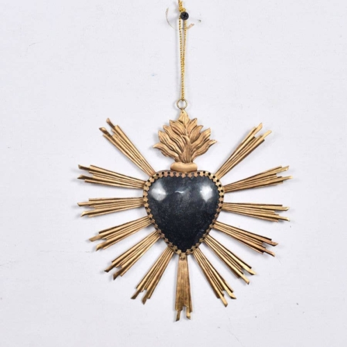 Set your heart on this striking Black & Gold Sacred Heart Hanging Ornament, a perfect statement piece to infuse your home with bold, maximalist charm. Inspired by the iconic Milagro hearts of Mexico, this glamorous ornament reimagines the traditional symbol of love and gratitude with a contemporary twist. Handcrafted in India, the design features a glossy black heart encircled by radiant golden sunbeams, creating an eye-catching blend of elegance and drama. Whether styled on a shelf, incorporated into a gallery wall, or showcased in your living room, bedroom, or bar corner, this artisan decoration makes a heartfelt addition to any space. A thoughtful gift for someone special or a luxurious treasure for your own collection. Details : – Black and gold Milagro heart hanging ornament – SIZE : 20 x 20cm – Handmade in India