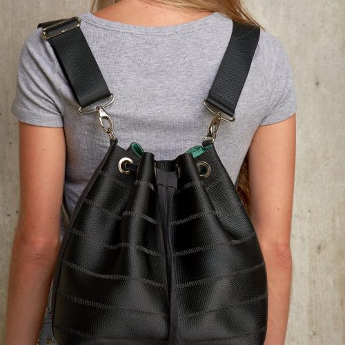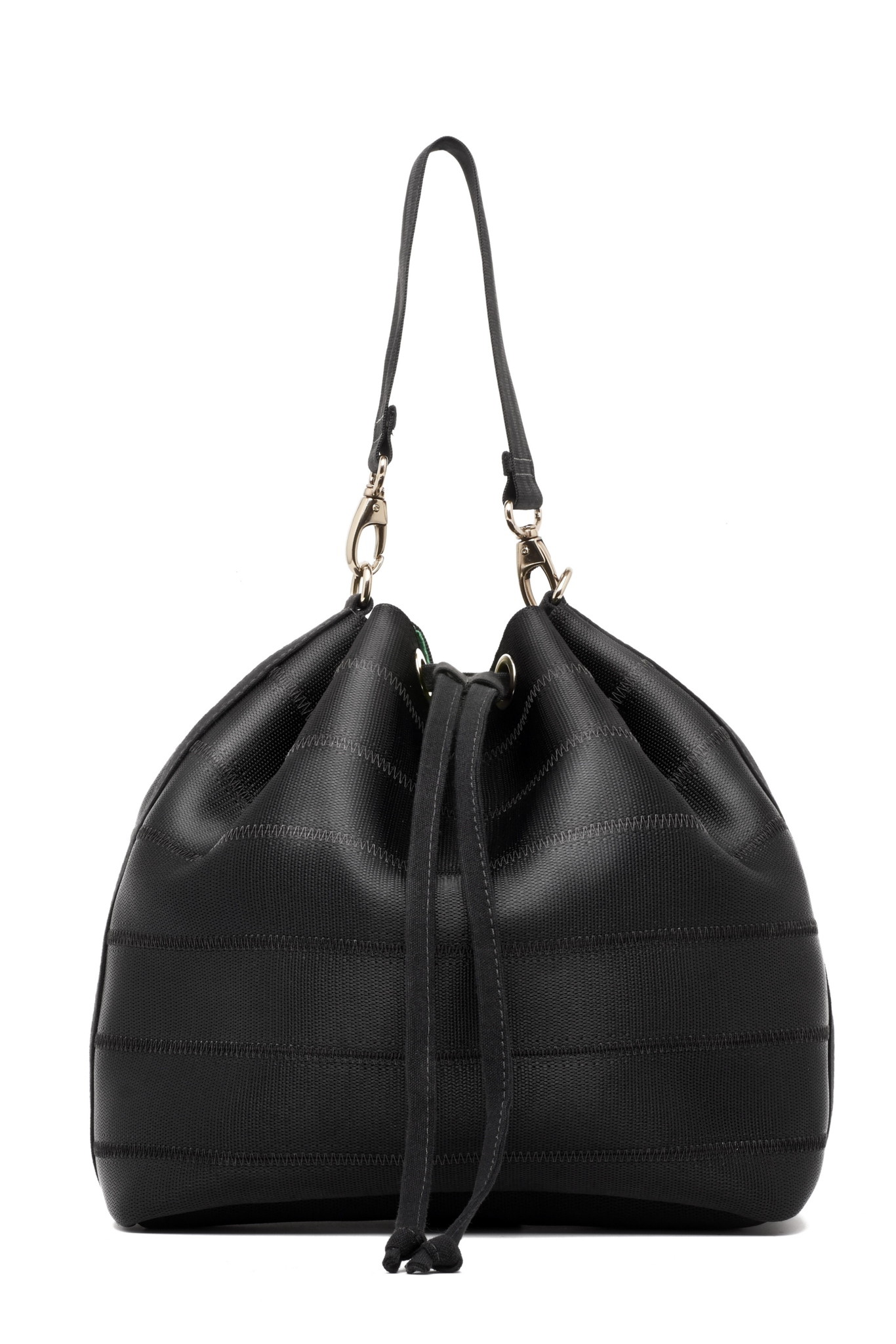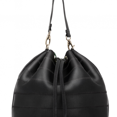 An everyday go-to, the black Ju seatbelt bucket handbag for women, by From Belo. A multi-functional convertible bucket bag named after our team member Jurema (Ju), who is a real multi-tasker!!