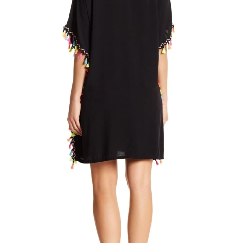 Cute Style Tunic – Black Kaftan with Multi Colored Tassels and Ties The Cute Style Tunic – Black Kaftan is a must-have piece for any fashion-forward individual who loves to make a statement. This stylish tunic features multi colored tassels and ties, which add a playful and festive touch to your wardrobe. The black kaftan style tunic is perfect for a tropical holiday, providing both comfort and elegance. The tassels at the neck and the hemline add the fun and frolic to your tropical holiday. Rest assured, you will stand out in this unique piece because it effortlessly combines style and functionality. This Cute Style Tuni is crafted from high-quality materials, ensuring durability and a comfortable fit. The loose, flowing design allows for easy movement, making it ideal for warm weather and beach outings. You can pair it with your favorite sandals, and accessorize with statement jewelry, to complete the look. Furthermore, the vibrant, multi colored tassels and ties provide a pop of color against the classic black fabric, creating a visually striking effect that is sure to turn heads. In addition to its chic appearance, the Cute Style Tuni – Black Kaftan with Multi Colored Tassels and Ties is incredibly versatile. You can wear it as a beach cover-up, a casual day outfit, or even dress it up for a night out. The possibilities are endless. Because of its versatility, this tunic is a fantastic addition to your wardrobe. Additionally, the easy-care fabric makes it simple to maintain, so you can enjoy wearing it again and again. Whether lounging by the pool, exploring a new city, or attending a summer party, this tunic is your go-to piece for effortless style and comfort. Finally, this Cute Style Tuni makes a wonderful gift for friends and family who appreciate fashionable yet practical clothing. Its unique design and cheerful colors are sure to bring joy to anyone who receives it. So, why wait? Discover the Cute Style Tuni – Black Kaftan with Multi Colored Tassels and Ties today and elevate your summer wardrobe with this fun, stylish, and versatile piece. Embrace the fun and frolic of tropical holidays with this delightful tunic, and let your fashion sense shine.