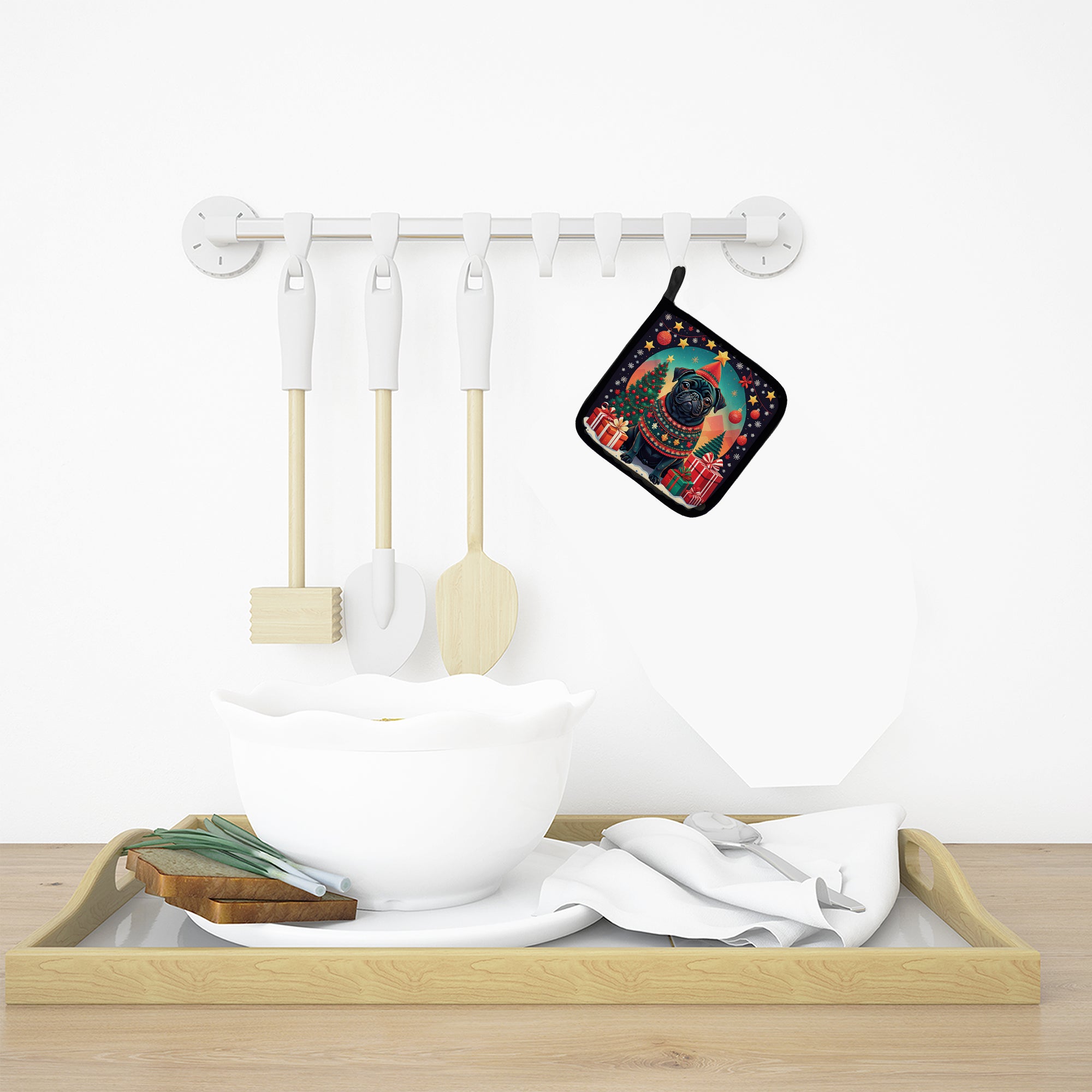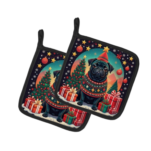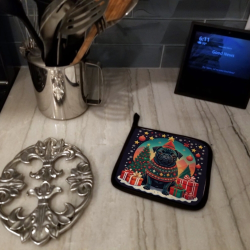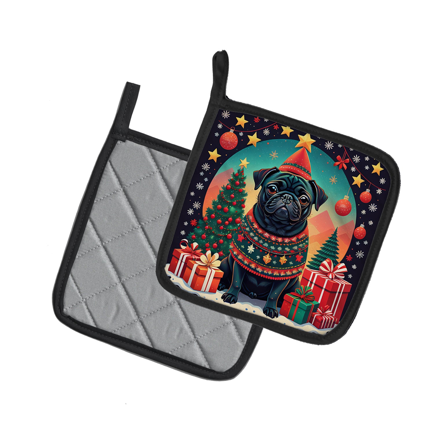 Pair of Pot Holders featuring breed specific Pug artwork. Celebrate Christmas with this Christmas Pair of Pot Holders. A Pair of Pot Holders to match your kitchen decor. Made in the USA these are thick and functional. Full color artwork decorates the front polyester fabric of the hot pad and accented by a black trim. Use these at as a trivet for your Thanksgiving or Christmas tablescape. Filled with insulated fabric and quilted for durability. These colorful pot holders will make a great gift for your favorite home cook or executive chef. Each pot holder measures approximately 7 1/2 inches by 7 1/2 inches. A hanging tab is included.