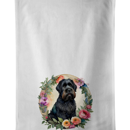 Kitchen Towel Set of 2 featuring breed specific Black Russian Terrier artwork. Spruce up your kitchen decor with Caroline’s Treasures Decorative White Kitchen Towel Set. This set of two dish towels showcases beautiful artwork from one of our talented artists, making them both practical and visually appealing. These towels are crafted from 100% cotton, offering excellent absorbency and durability, making them ideal for any kitchen task. Each white towel measures 19 inches by 28 inches, providing ample coverage for drying dishes or wiping up spills. The standout feature of these towels is the full-color artwork design printed on each one. They can serve as a vibrant accent in your kitchen, turning a functional item into a delightful piece of decor. When it comes to care, these towels are machine washable in cold water and can be dried on low heat. Remember to always use a pressing cloth when pressing the design, and avoid using bleach on the decorated towel. The Decorative White Kitchen Towel Set makes a great gift or a stylish addition to your own kitchen.