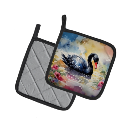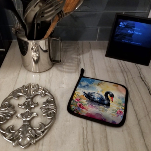 Pair of Pot Holders featuring breed specific Black Swan artwork. A Pair of Pot Holders to match your kitchen decor. Made in the USA these are thick and functional. Full color artwork decorates the front polyester fabric of the hot pad and accented by a black trim. Use these at as a trivet for your Thanksgiving or Christmas tablescape. Filled with insulated fabric and quilted for durability. These colorful pot holders will make a great gift for your favorite home cook or executive chef. Each pot holder measures approximately 7 1/2 inches by 7 1/2 inches. A hanging tab is included.