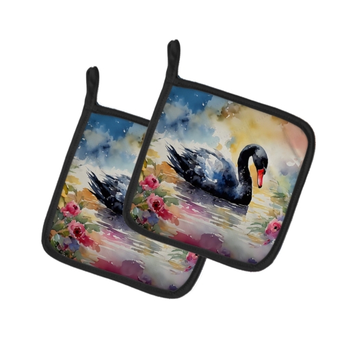 Pair of Pot Holders featuring breed specific Black Swan artwork. A Pair of Pot Holders to match your kitchen decor. Made in the USA these are thick and functional. Full color artwork decorates the front polyester fabric of the hot pad and accented by a black trim. Use these at as a trivet for your Thanksgiving or Christmas tablescape. Filled with insulated fabric and quilted for durability. These colorful pot holders will make a great gift for your favorite home cook or executive chef. Each pot holder measures approximately 7 1/2 inches by 7 1/2 inches. A hanging tab is included.