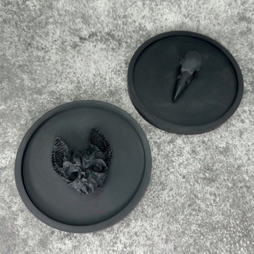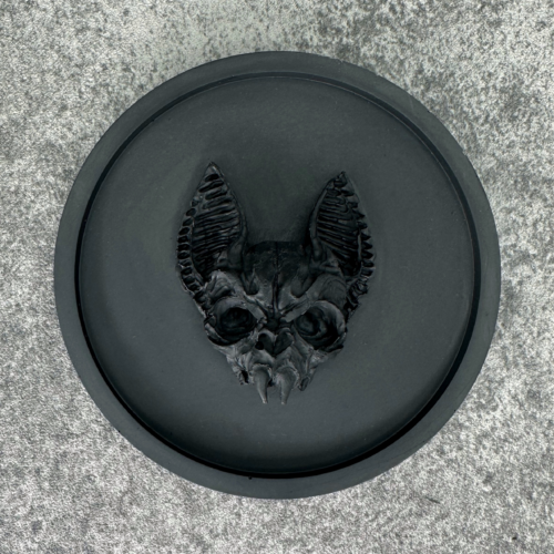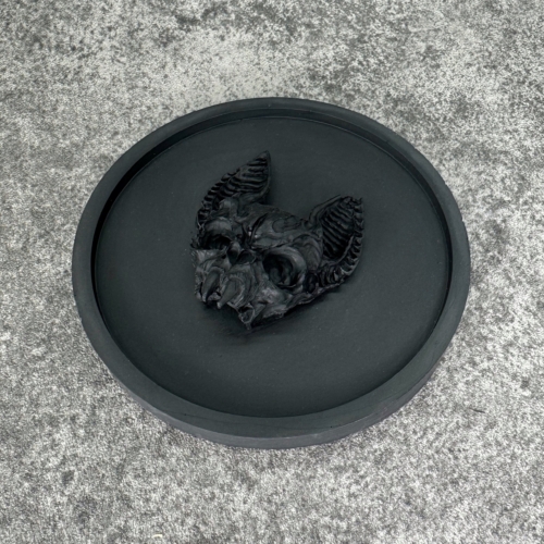 Add a touch of the macabre to your decor with our handcrafted Black Jesmonite Trinket Tray, featuring a captivating vampire cat skull relief at its center. Perfect for storing jewelry, keys, coins, or any small treasures, this unique piece effortlessly combines gothic charm with modern elegance. Features:- Material: High-quality, eco-friendly jesmonite- Color: Deep, striking black- Design: Intricate vampire cat skull relief at the center- Shape: Circular with a smooth, polished finish- Uses: Ideal for organizing jewelry, keys, coins, or small trinkets- Handcrafted: Each tray is carefully crafted by hand, ensuring a one-of-a-kind piece Dimensions; 11cm x 11cm x 3.5cm Why You’ll Love It:- Unique Artistry: The detailed vampire cat skull design adds a mysterious and enchanting touch to any space.- Versatile Functionality: Whether on your vanity, bedside table, or entryway, this tray serves both as a practical organizer and a statement piece.- Perfect Gift: A distinctive gift for fans of gothic decor, Halloween enthusiasts, or anyone who appreciates unique and artistic home accessories. Care Instructions:- Gently wipe with a damp cloth to clean.- Avoid harsh chemicals or abrasive materials to maintain the tray’s finish. Bring a bit of dark elegance to your home with our Black Jesmonite Trinket Tray. Order now and enjoy the perfect blend of beauty and functionality! Please note that due to the intricate nature of the design and the handmade process that each piece is unique and may differ slightly from the photo.