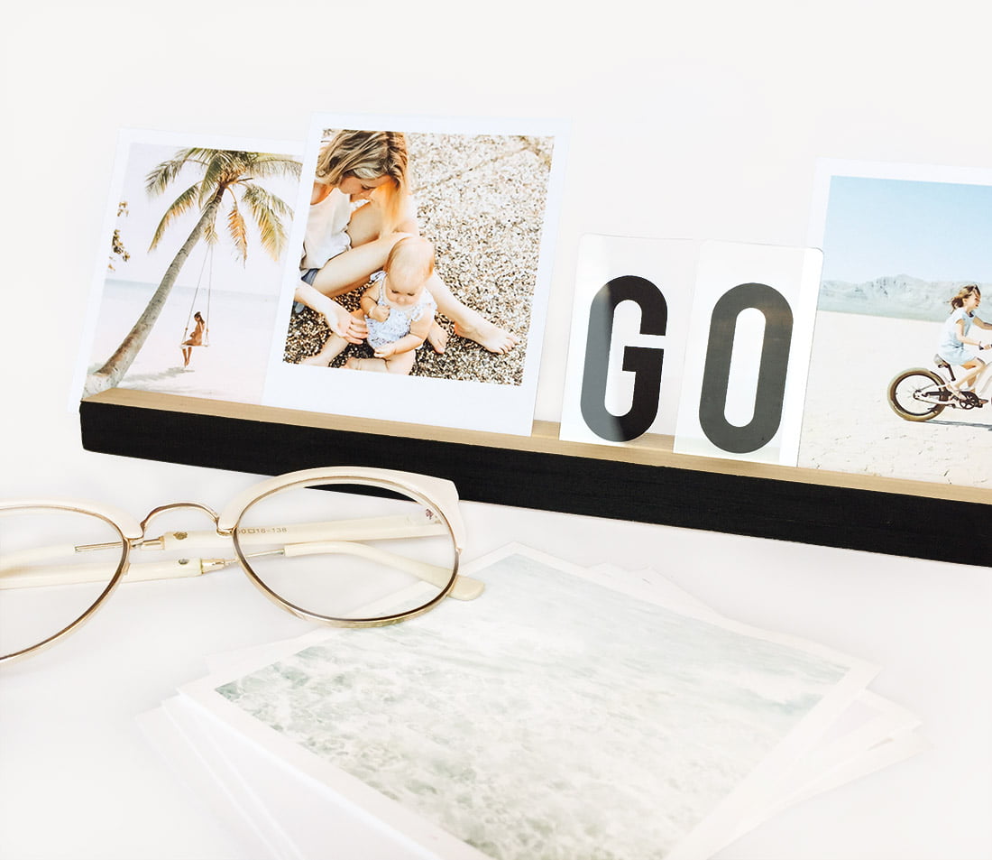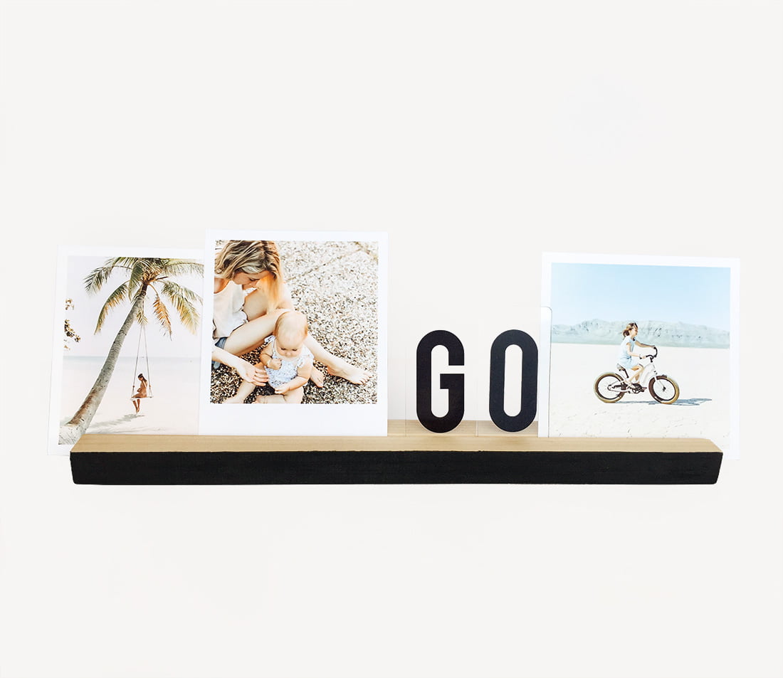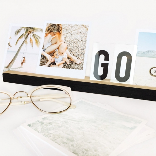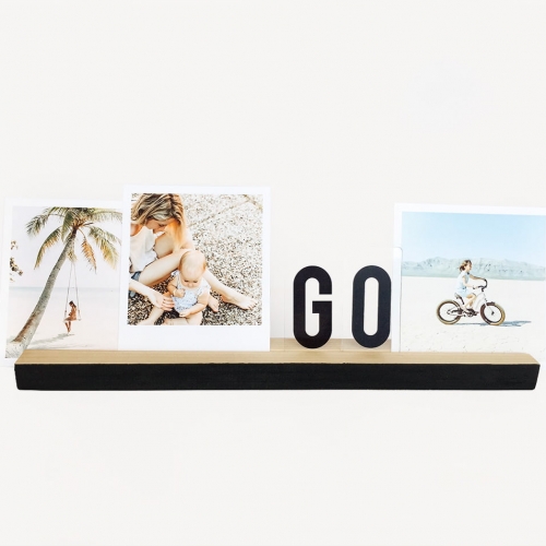 Black wooden photo ledge with is the perfect tabletop accessory for your home office living room nursery or literally any other room! This wooden display stand can hold photos art prints business cards and different signage. Use it for your wedding dinner party or coffee shop – it is so versatile. Handcrafted from natural eco-friendly wood with white accent in the front. The groove is wide enough to accommodate all different kinds of paper. Designed for various photo sizes including Instax photos polaroids 4×4 – up to 5×7.