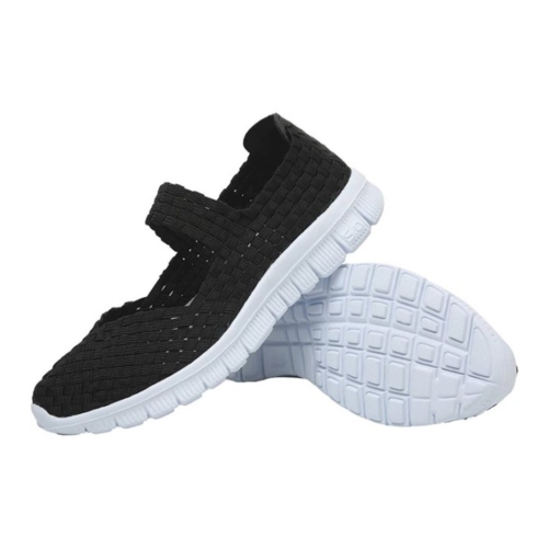 Comfortable and lightweight Mary Jane style slip on shoes featuring a breathable woven elastic upper that stretches to fit your feet.