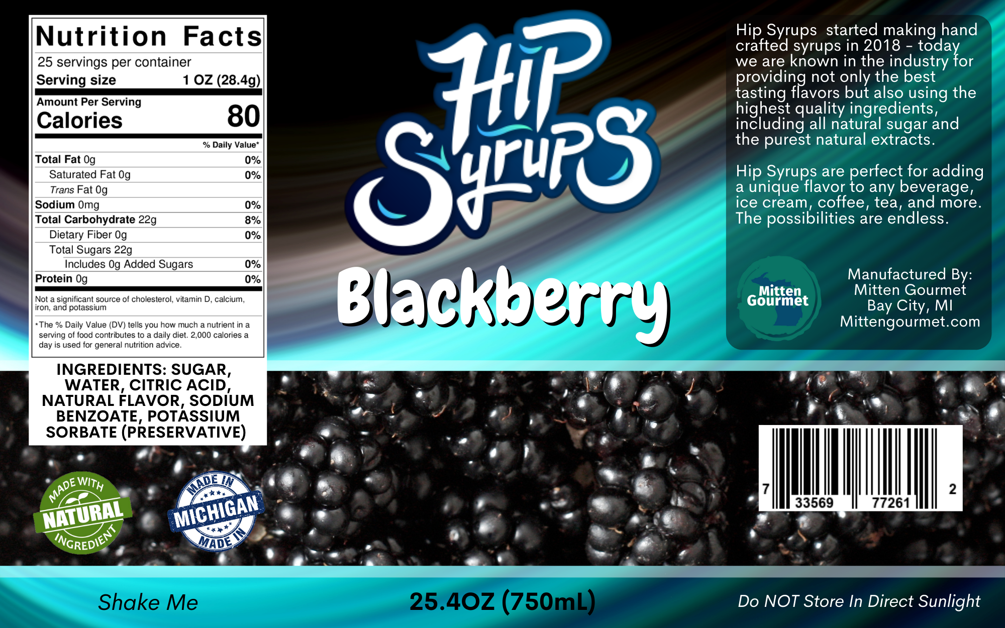 Natural flavoring, that comes in sugar or sugar-free! Ideal for your water, tea, smoothies, shakes, and much more! All products are handcrafted & made right in Michigan! This handcrafted Blackberry Hip Syrup real fruit extract is so spot on! Tastes just like a blackberry off of a blackberry vine!
