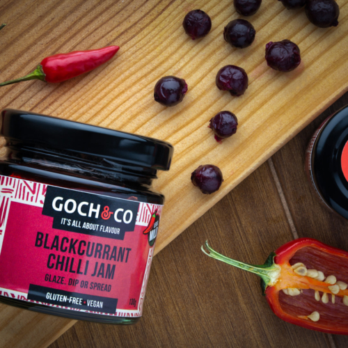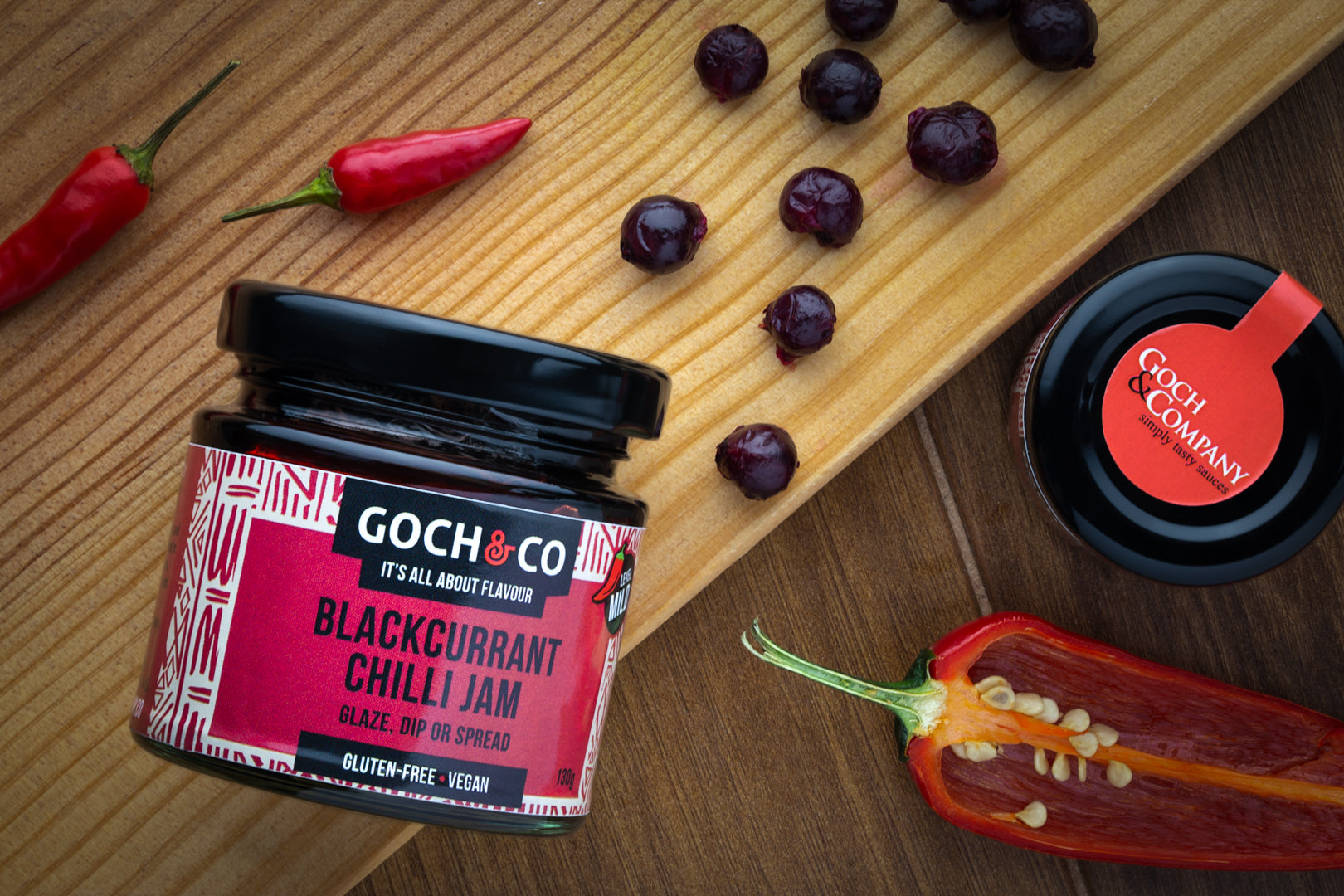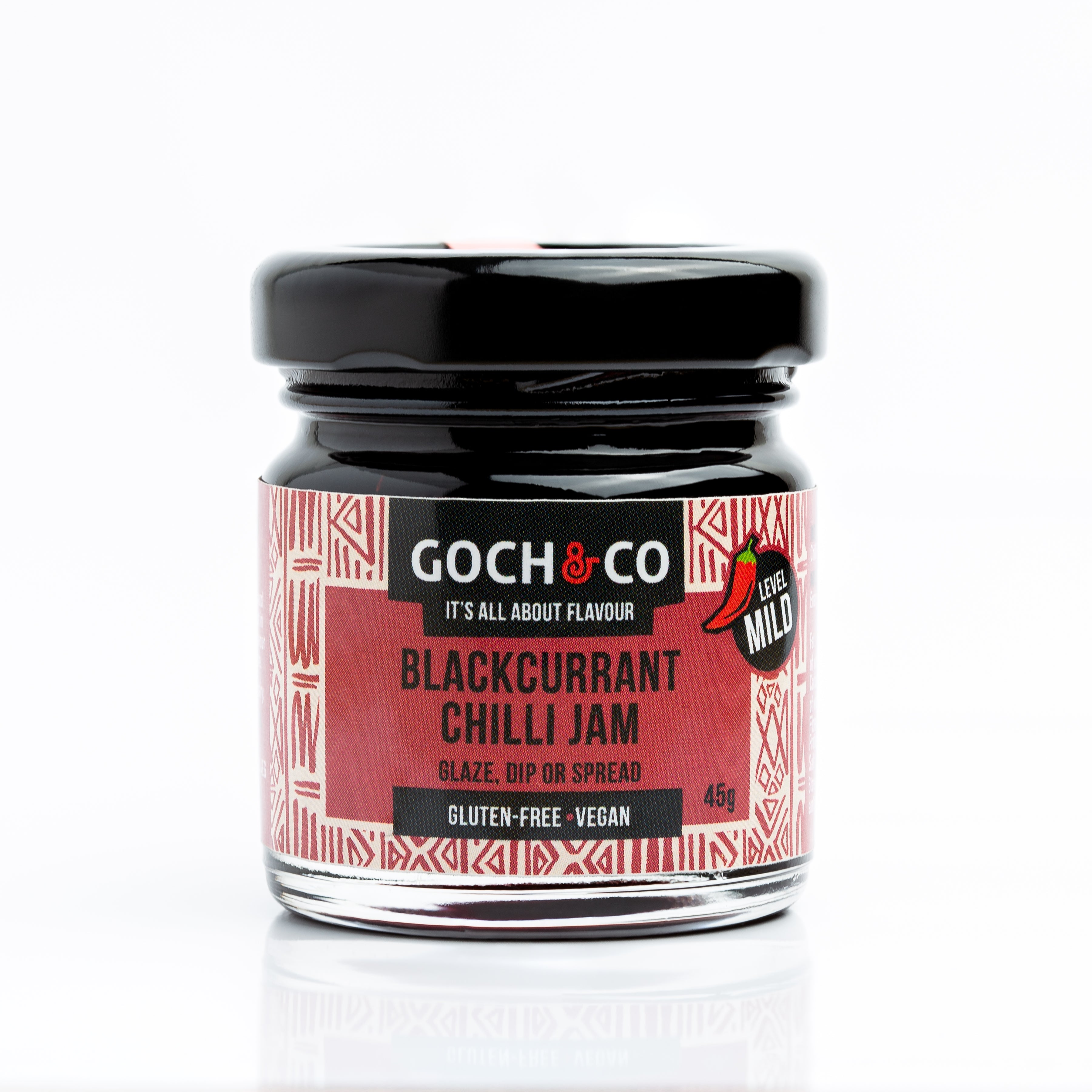 Blackcurrant Chilli Jam A Blackcurrant Chilli Jam that is mild, with unique tastes that are rich, earthy, and bursting with deep tart and sweet overtones. A great accompaniment to chocolate and cheesecake. Blackcurrant Chilli Jam is a wonderful flavour for ice cream, custard, chocolate brownies and muffins, toast, and crumpets. A compliment to cheese and cured meat platters, pâté, and terrines. Add great taste to gravy, lamb, beef, and duck with our Blackcurrant Chilli Jam. You can add to yogurt, desserts, cakes, and smoothies Gluten-free. No GM. No GMS. Vegetarian. Vegan. No Artificial Additives. Recyclable pack. Made in Wales, UK. Heat Level: Mild Servings per 100g: 20 Each Serving: 5g Ingredients: Blackcurrants (54%), Chilli Peppers, Sugar. Allergen Advice: For Allergens, including cereals containing gluten, see ingredients in BOLD. Produced in a facility that handles cereals and nuts. Nutrition:Typical Values 100g contains: Energy 810Kj/191Kcal Fat 0g of which Saturates 0g Carbohydrates 46g of which Sugars 46g Fibre 0.8g Protein 0.8g Salt 0g Country of origin: Wales, United Kingdom. Storage: Store in a cool and dry place.
