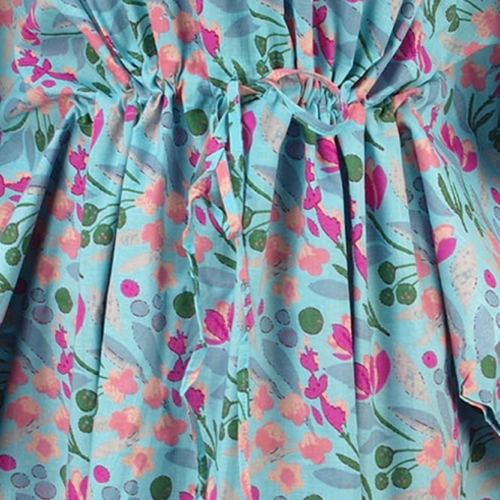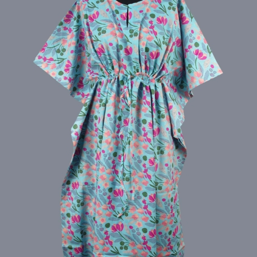 Block Printed Cotton Long Kaftans – Pink Blossom On Aqua