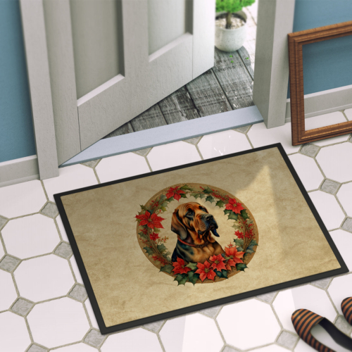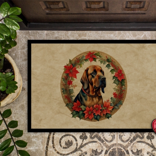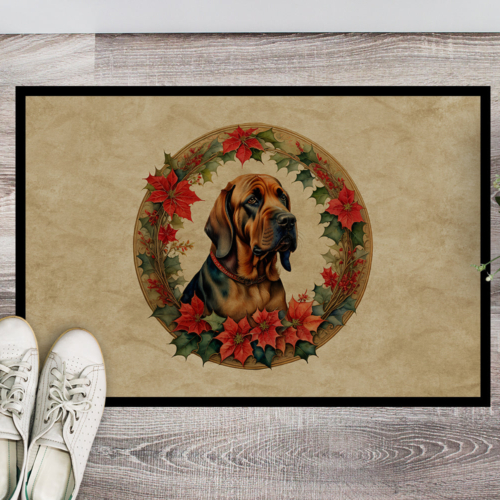 Doormat featuring breed specific Bloodhound artwork. Celebrate Christmas with this Christmas Doormat. Welcome your guests in style with our Artwork Door Mat, designed to withstand almost any weather condition. This mat, measuring approximately 18 by 27 inches, is held together by durable black binding tape. Its top layer, composed of polyester felt, is dyed with the eye-catching image you see on the mat. A few layers below provide the mat with stability, while its rubber bottom is stamped to help prevent slipping and ensures safety. Our mat works wonderfully as both an indoor or outdoor door mat. For cleaning, simply hose it off with water or use a power washer – no need for any cleaner that produces suds. Avoid scrubbing with a brush, instead, opt for the vacuum on floor setting. Designed manufactured and printed in the USA, this mat is a perfect addition to your porch, outdoor kitchen, entryway, or any indoor space. Its unique design makes it a charming decorative rug that greets your guests and adds a stylish touch to your home decor.