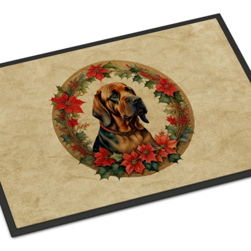 Doormat featuring breed specific Bloodhound artwork. Celebrate Christmas with this Christmas Doormat. Welcome your guests in style with our Artwork Door Mat, designed to withstand almost any weather condition. This mat, measuring approximately 18 by 27 inches, is held together by durable black binding tape. Its top layer, composed of polyester felt, is dyed with the eye-catching image you see on the mat. A few layers below provide the mat with stability, while its rubber bottom is stamped to help prevent slipping and ensures safety. Our mat works wonderfully as both an indoor or outdoor door mat. For cleaning, simply hose it off with water or use a power washer – no need for any cleaner that produces suds. Avoid scrubbing with a brush, instead, opt for the vacuum on floor setting. Designed manufactured and printed in the USA, this mat is a perfect addition to your porch, outdoor kitchen, entryway, or any indoor space. Its unique design makes it a charming decorative rug that greets your guests and adds a stylish touch to your home decor.