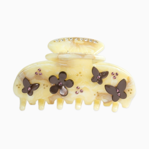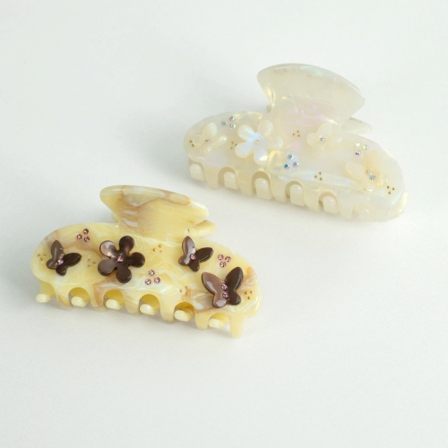 The Blossom Glow Floral Hair Claw Clip features a warm marbled ivory base adorned with delicate flower cut-out details and subtle crystal accents for a soft, romantic finish. SIZE : 50*79mm, 46*80m. MATERIAL : ACRYLIC,GLASSS TONE