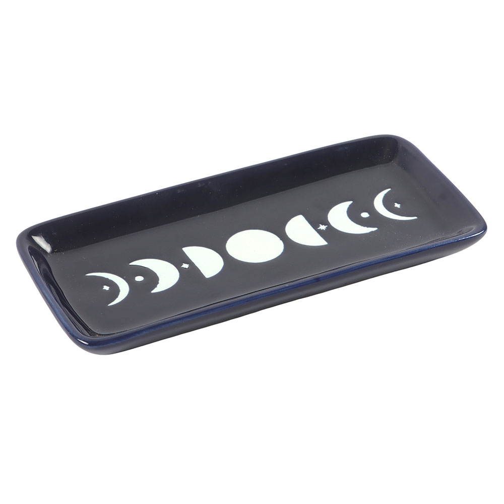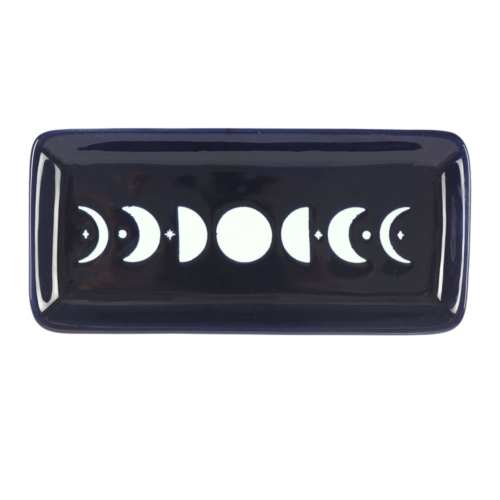 This trinket dish is finished with a moon phase design, making it ideal for holding rings, crystals or other tiny treasures. A practical and mystical touch for dressing tables or bedside altars. Designed by Something Different Wholesale and part of the Blue Moon collection of celestial gifts and home decor.