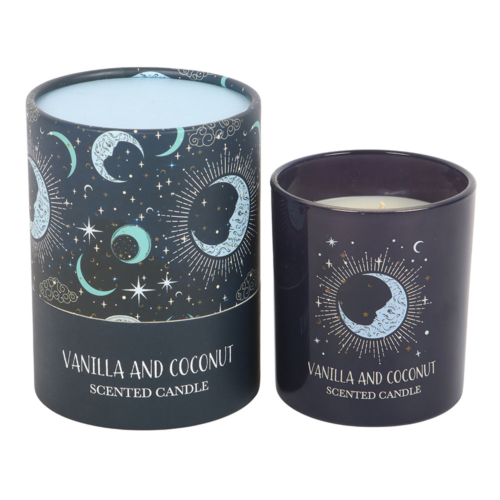 Fill your space with a soft, creamy blend of vanilla and coconut using this celestial candle. Perfect for quiet evenings or gifting to lovers of moonlit nights. Approximately 35-hour burn time. Made from paraffin wax. Never leave a lit candle unattended. Designed by Something Different Wholesale and part of the Blue Moon collection of celestial gifts and home decor.