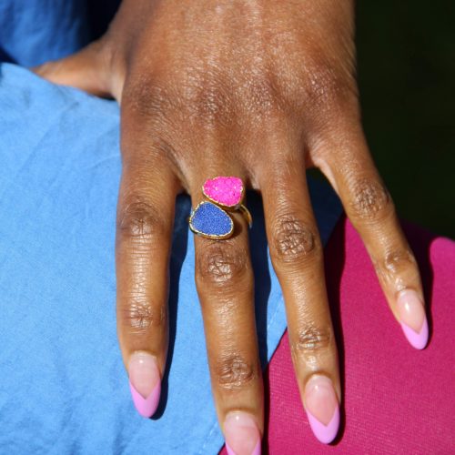 Colourful druzy stone gold adjustable rings set in gold-plated metal.  The colour intensities and shapes vary from ring to ring making each item unique!  A beautifully created ring at an affordable price bang on trend with this season’s colour craze.