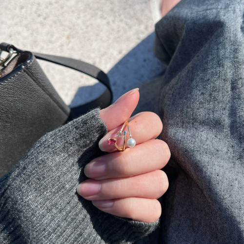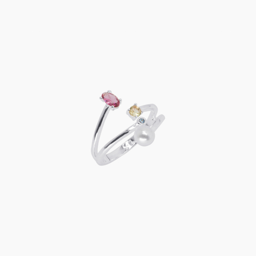 Infused with the soft charm of a morning bloom, this adjustable open ring features a radiant palette of delicate pink, warm yellow, and clear cubic zirconia stones, beautifully complemented by a luminous pearl.