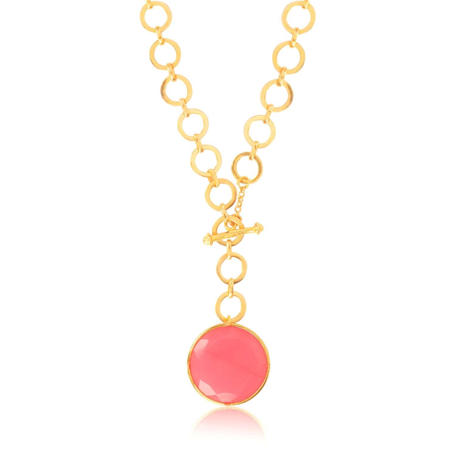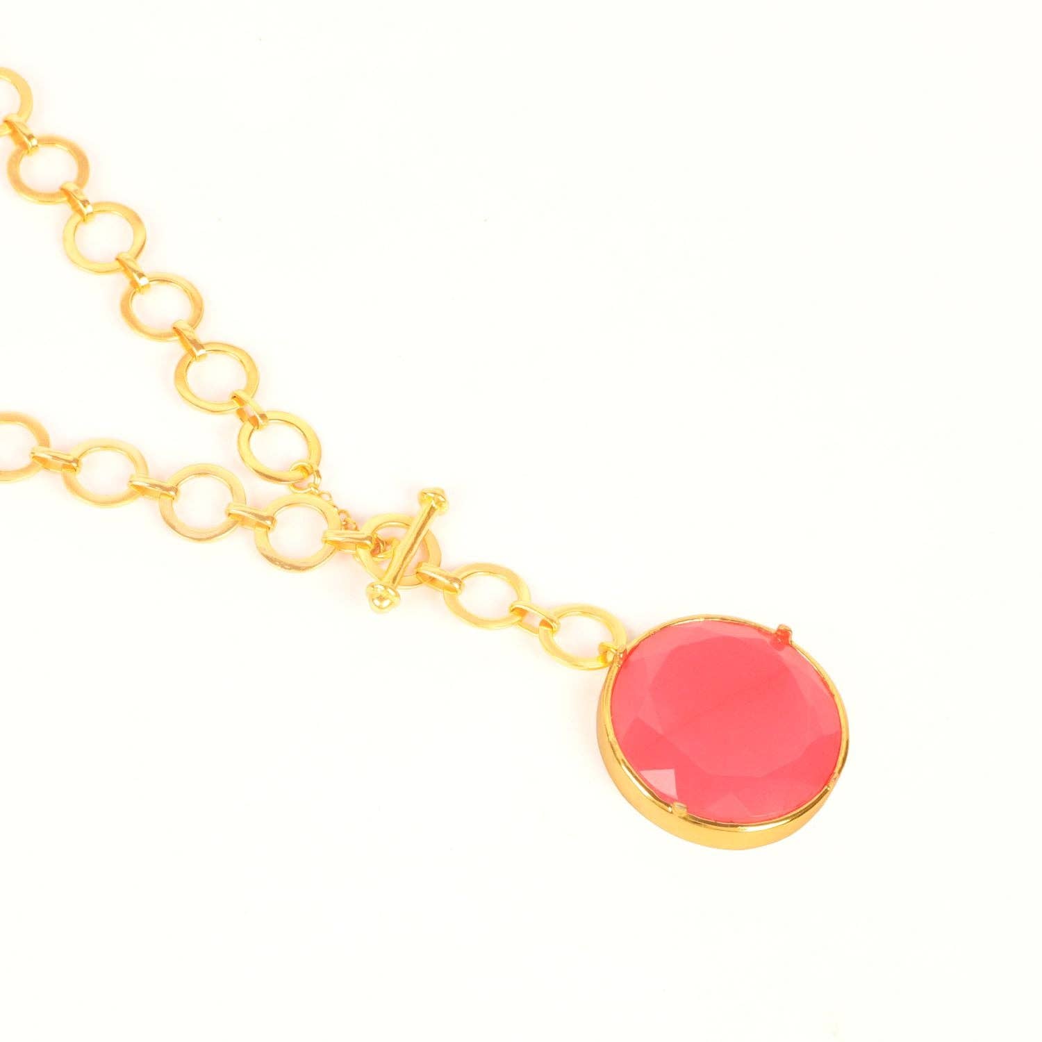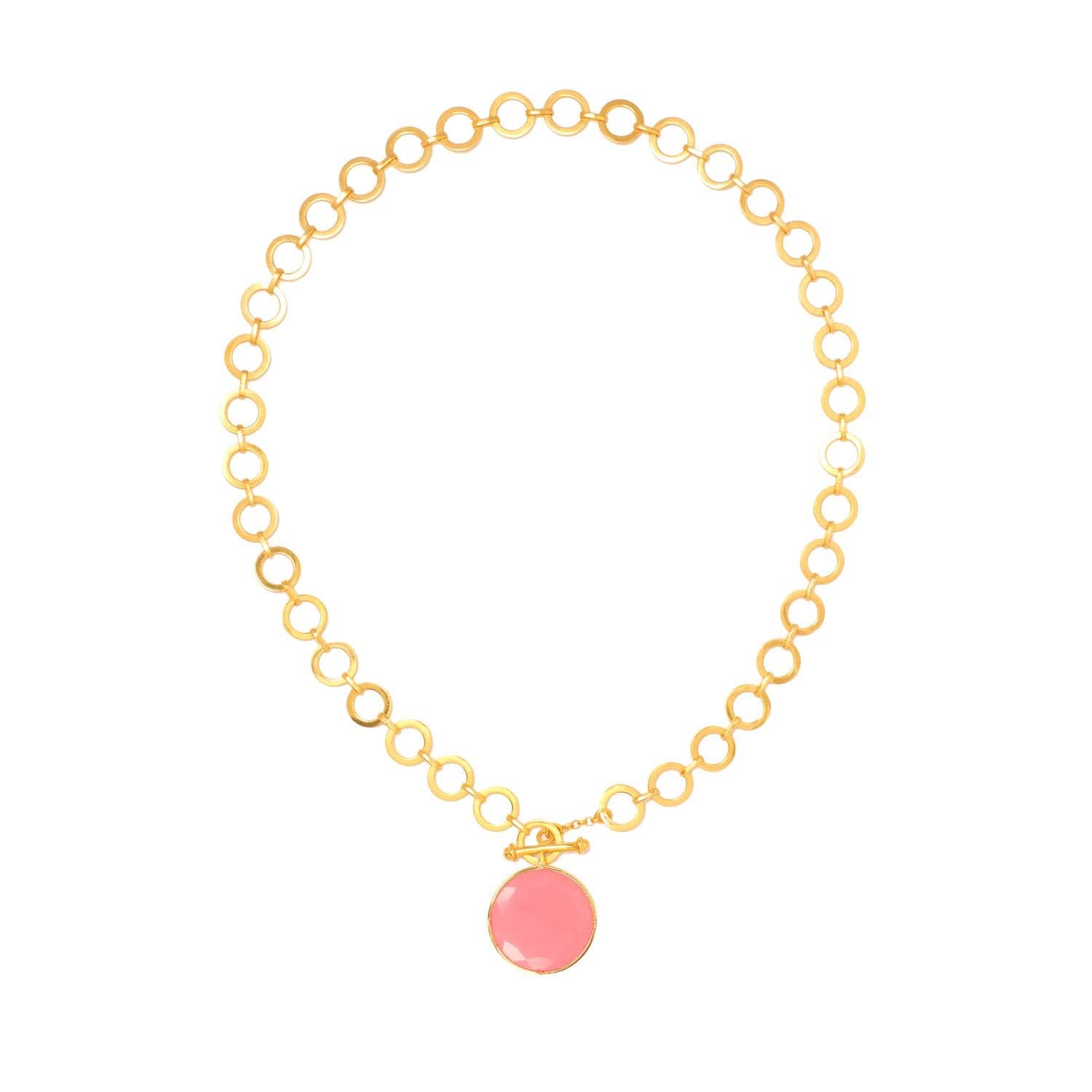 Add a touch of femininity and elegance with this Blushing Pink Crystal Pendant. The soft, enchanting pink crystal is beautifully suspended from a sleek loop chain, creating a graceful and modern look. Designed with a secure T-lock closure, this necklace ensures both style and comfort.The delicate Pink crystal adds a pop of subtle color, making it the perfect accessory for both casual and formal occasions. Whether you’re dressing up a simple outfit or adding a sophisticated touch to your evening wear, this pendant is sure to captivate.22ct gold plated Brass,Length: 22 inchesPendant measures 1 inchesAdjustable to any link